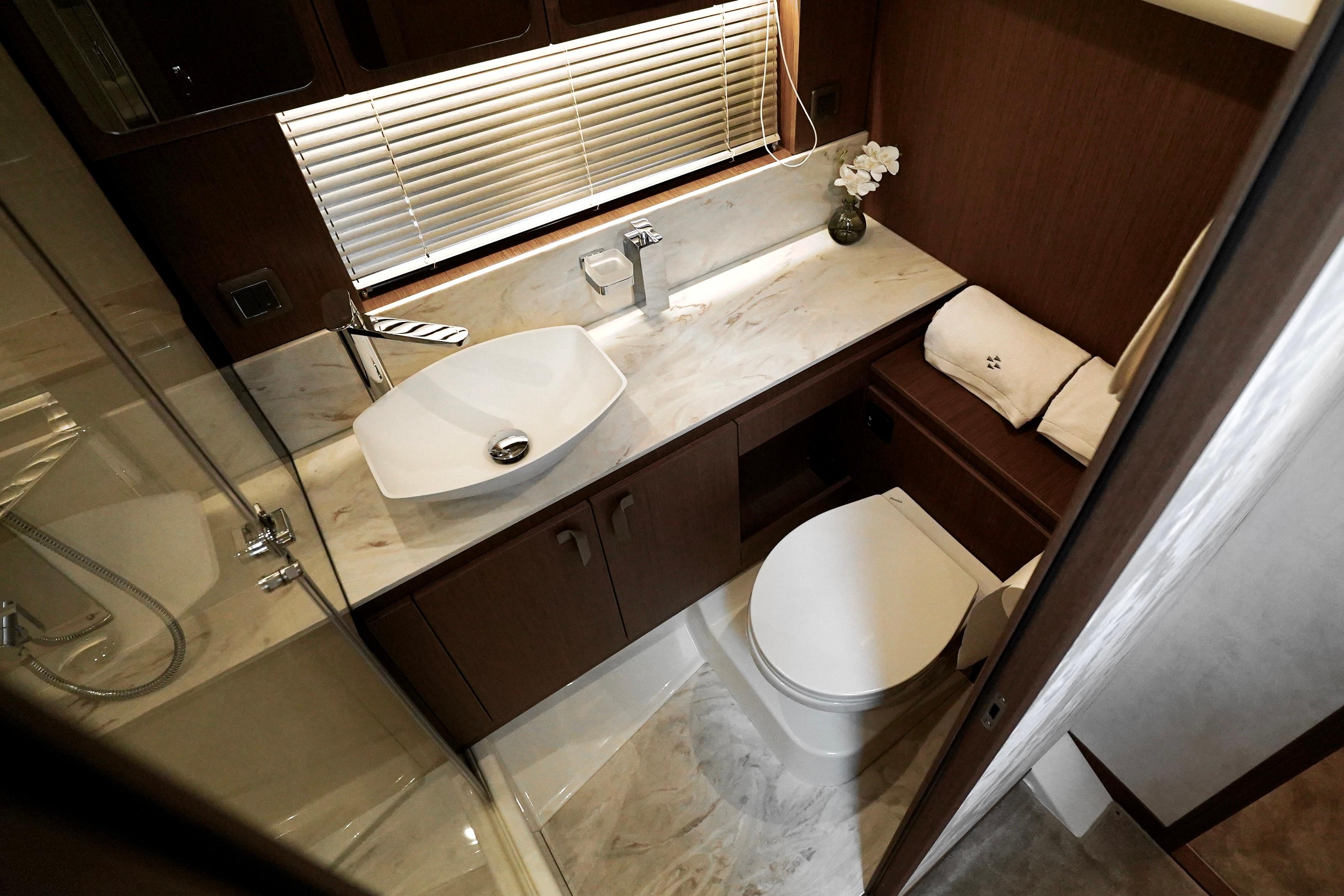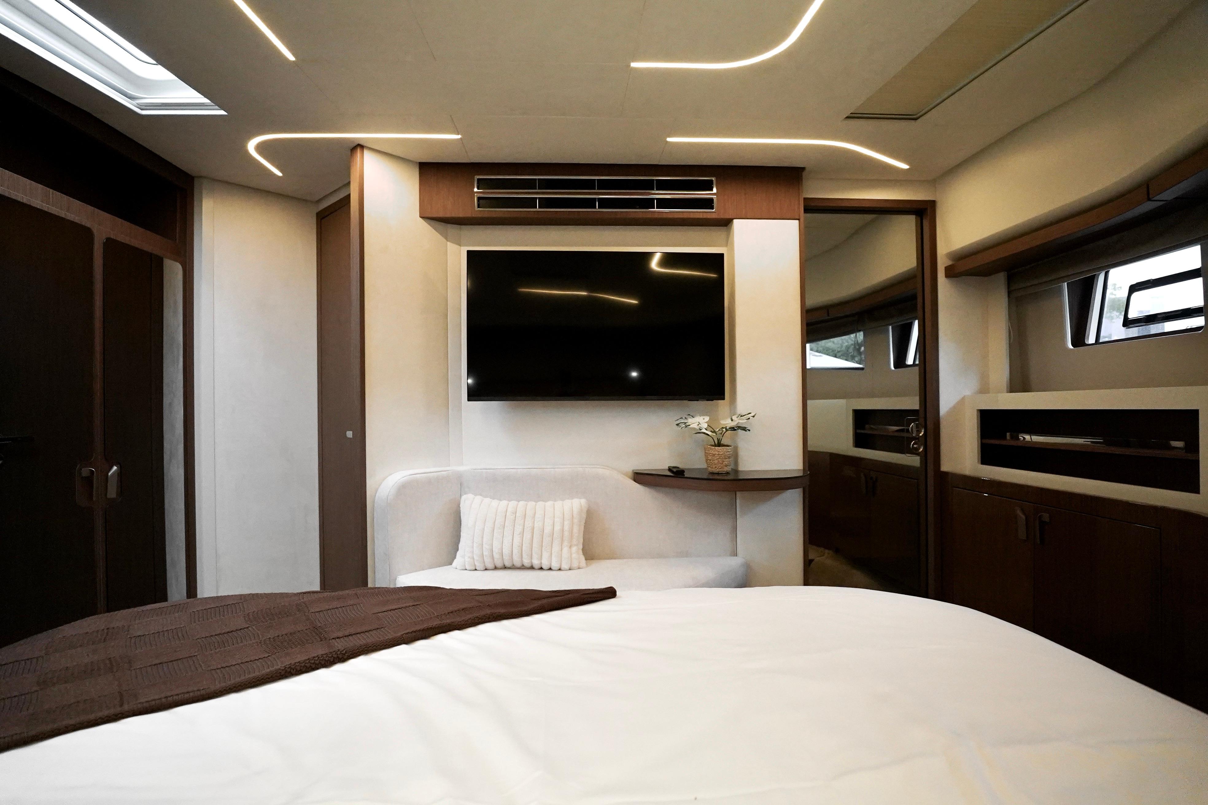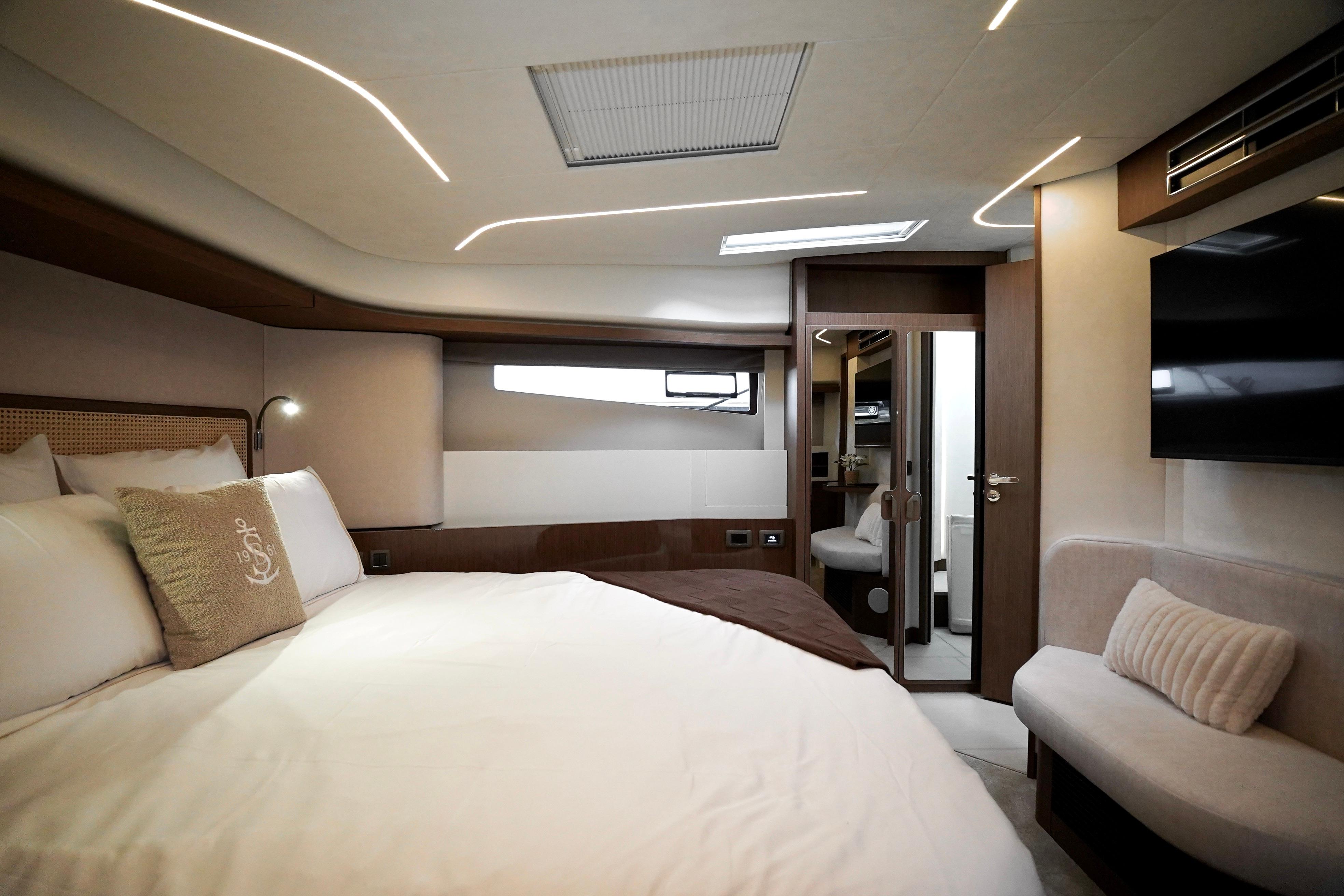 The owner's suite features a remarkable interior volume, with 2 meters of headroom, bathed in natural light. Located forward for greater privacy and sound insulation, far from the engine room and the dock, this true suite comes with a private bathroom and separate shower, a large king-sized berth, and generous hanging lockers.