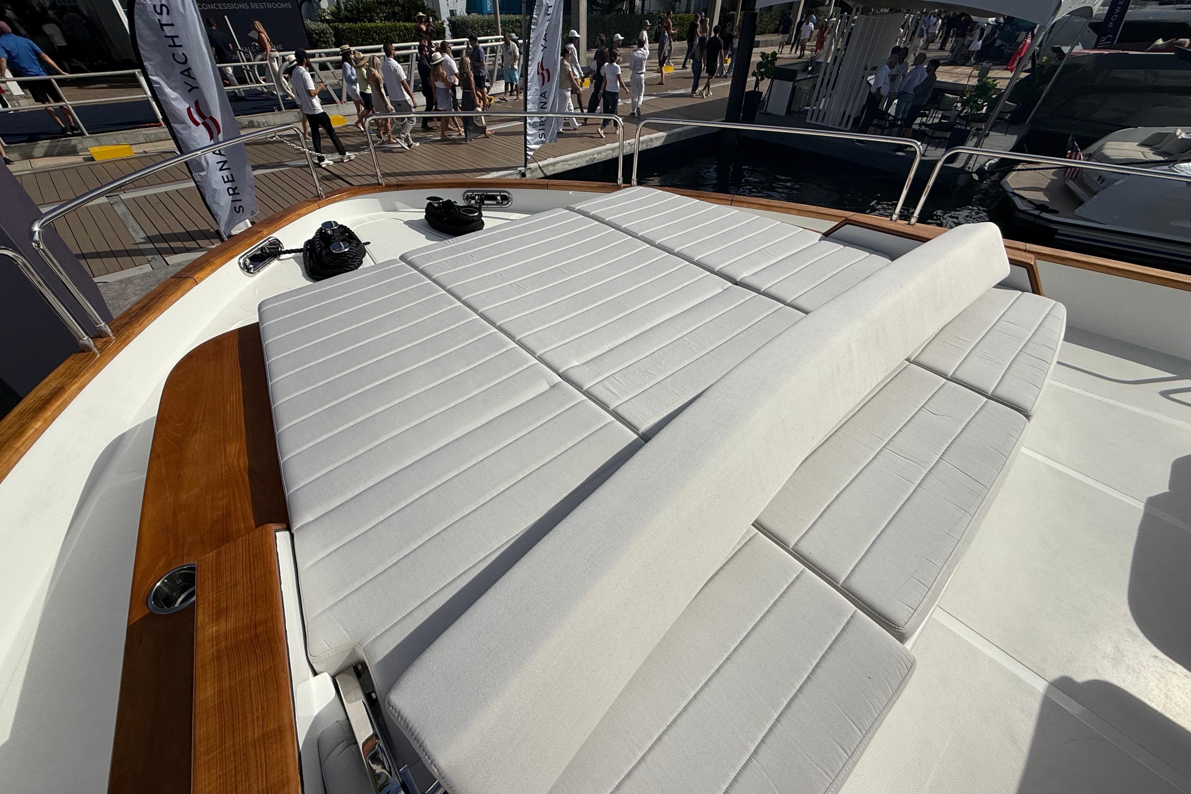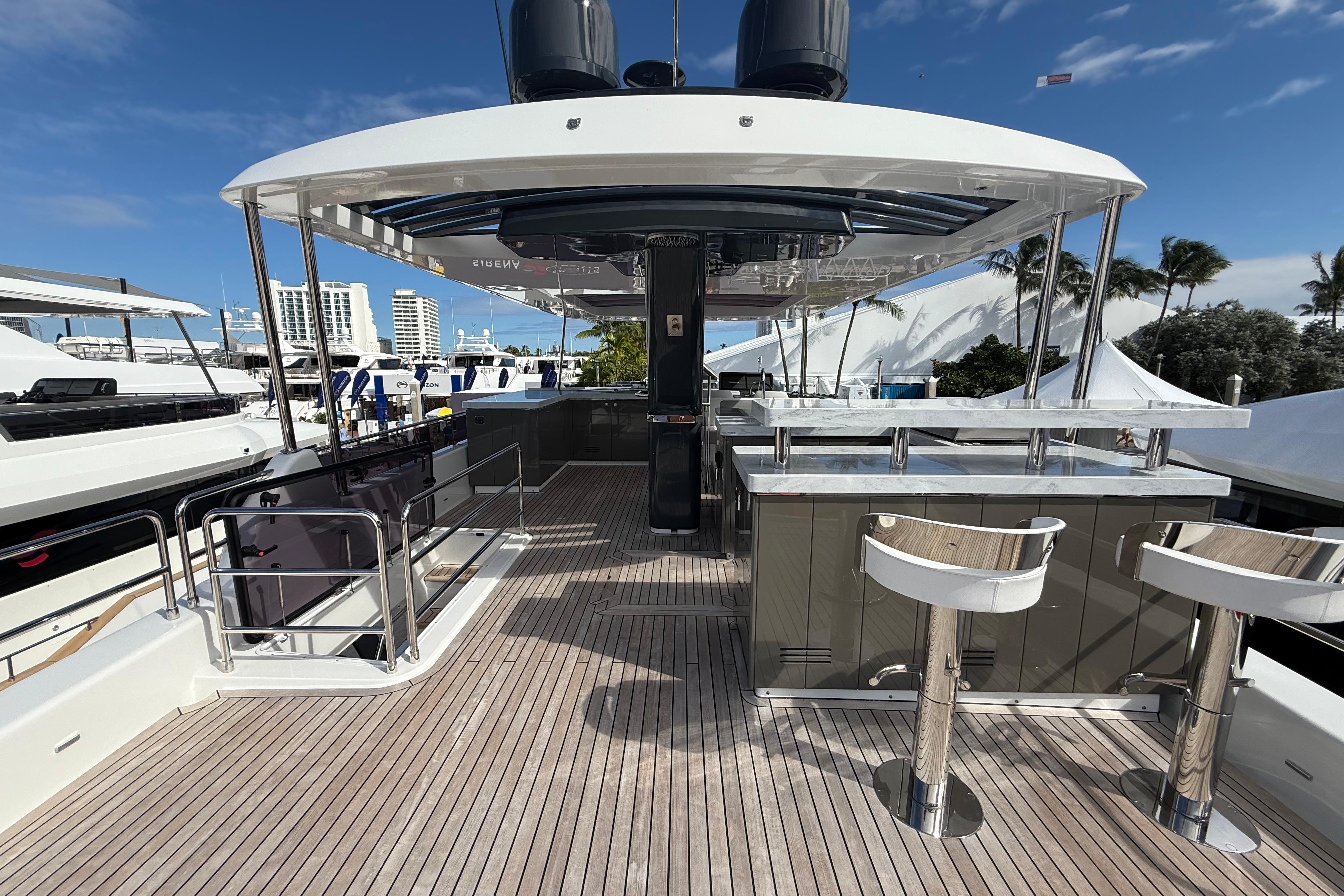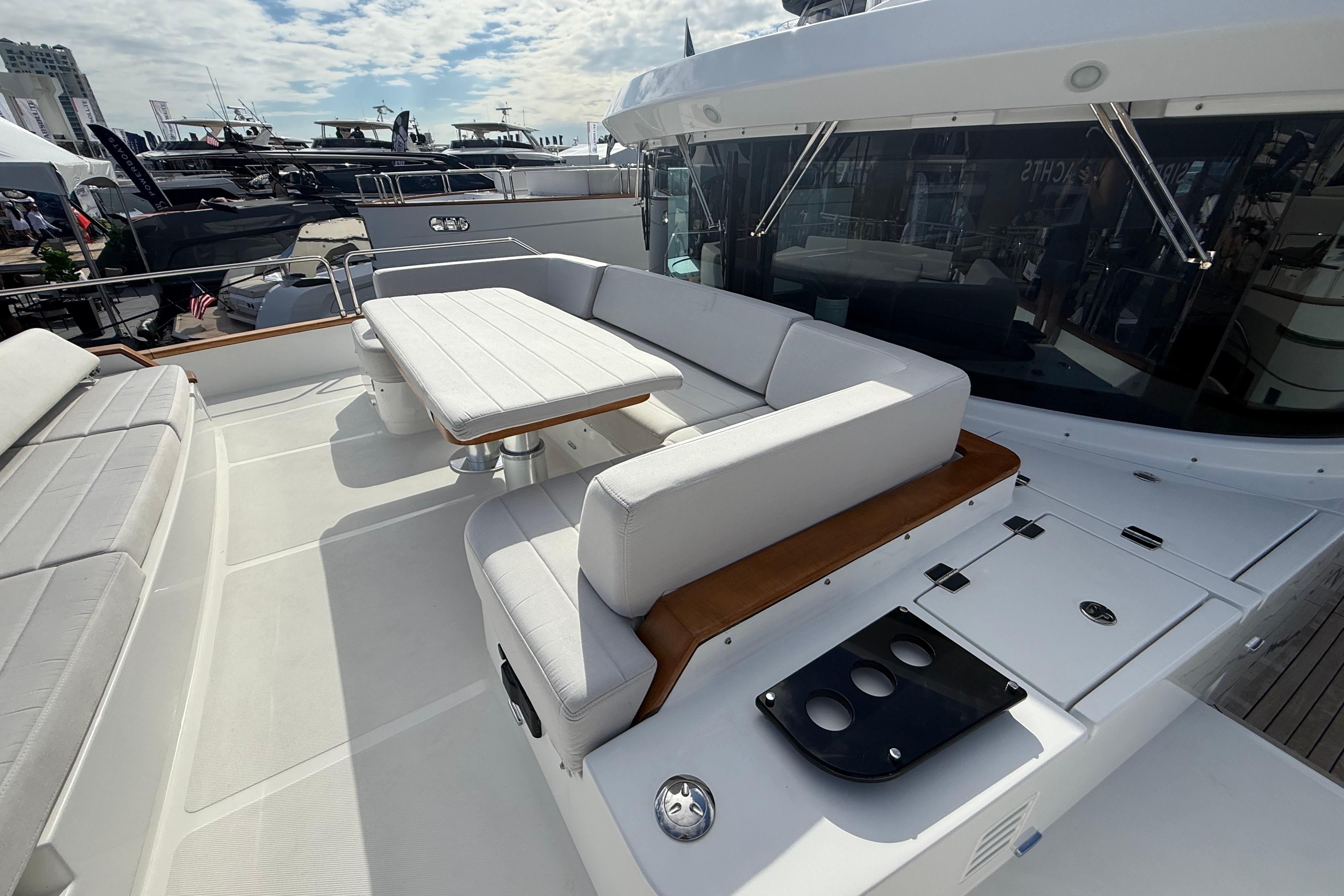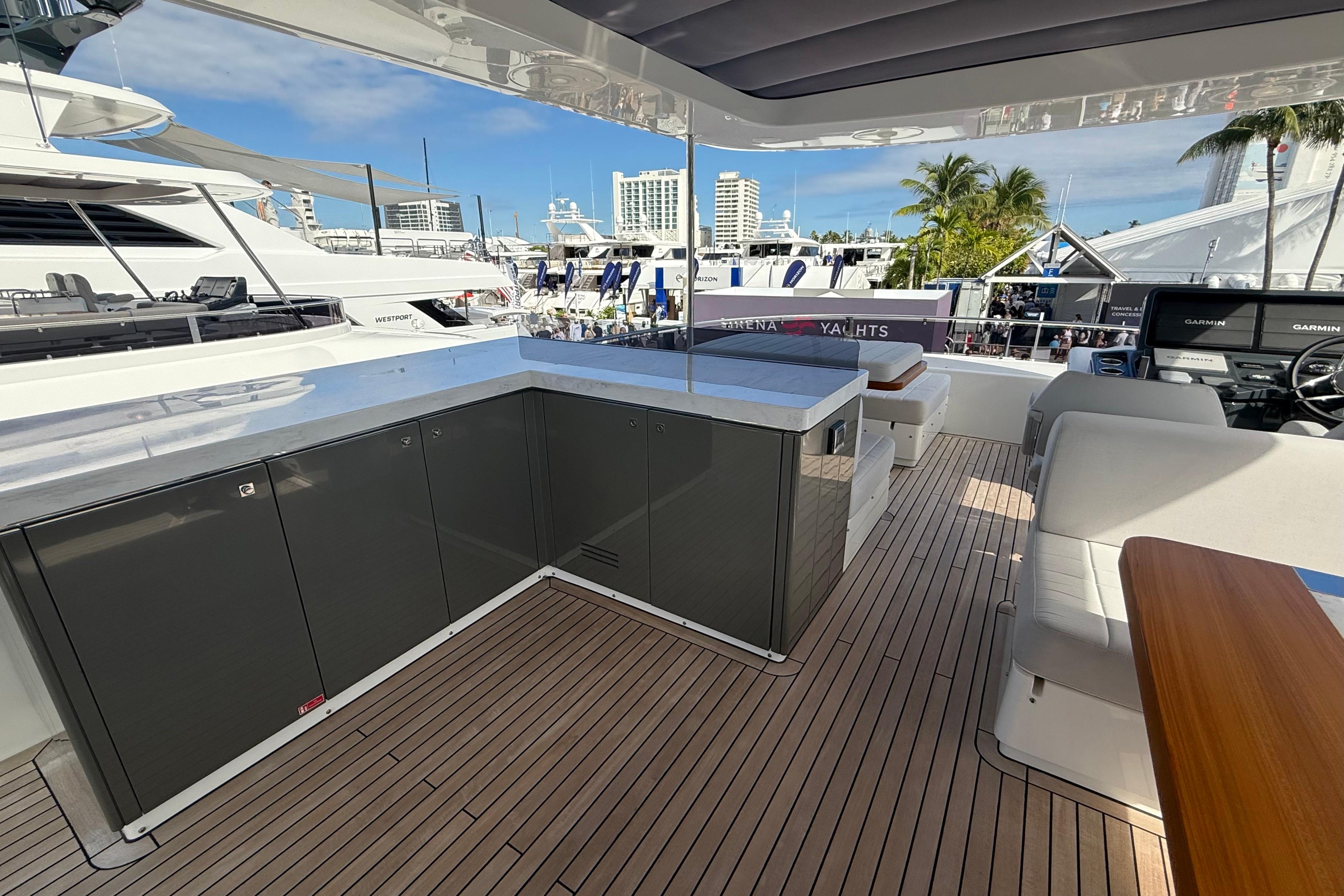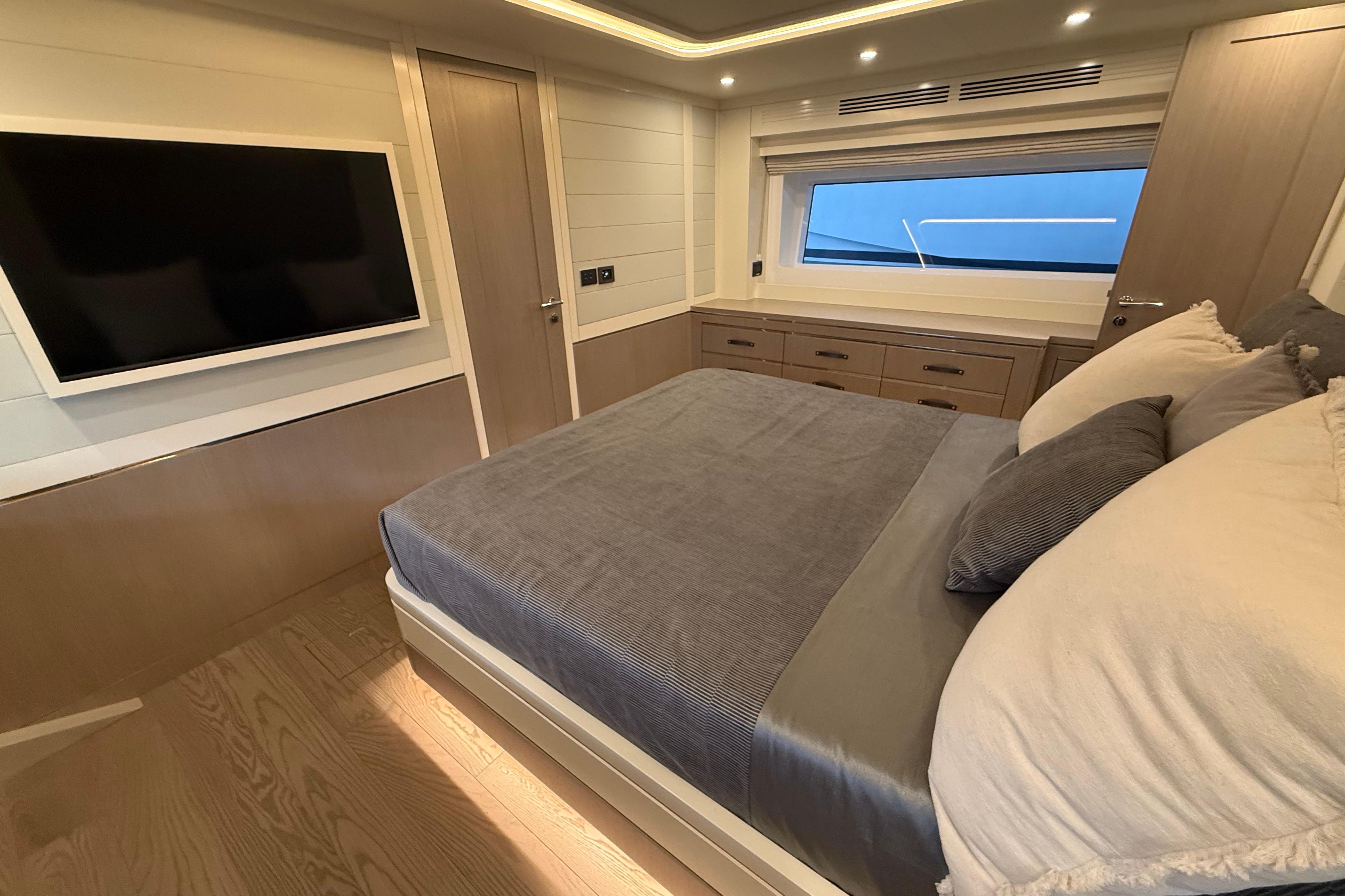 At the stern, a large hydraulic swim platform creates the perfect spot for swimming, lounging, or launching a tender. The aft deck flows naturally into the salon, making it ideal for hosting friends or relaxing with family. Up front, the foredeck offers another private space to unwind, complete with a sunpad and forward seating. The flybridge is a major highlight, extremely open, social, and versatile, with plenty of room for dining, relaxing, or taking in the views underway.