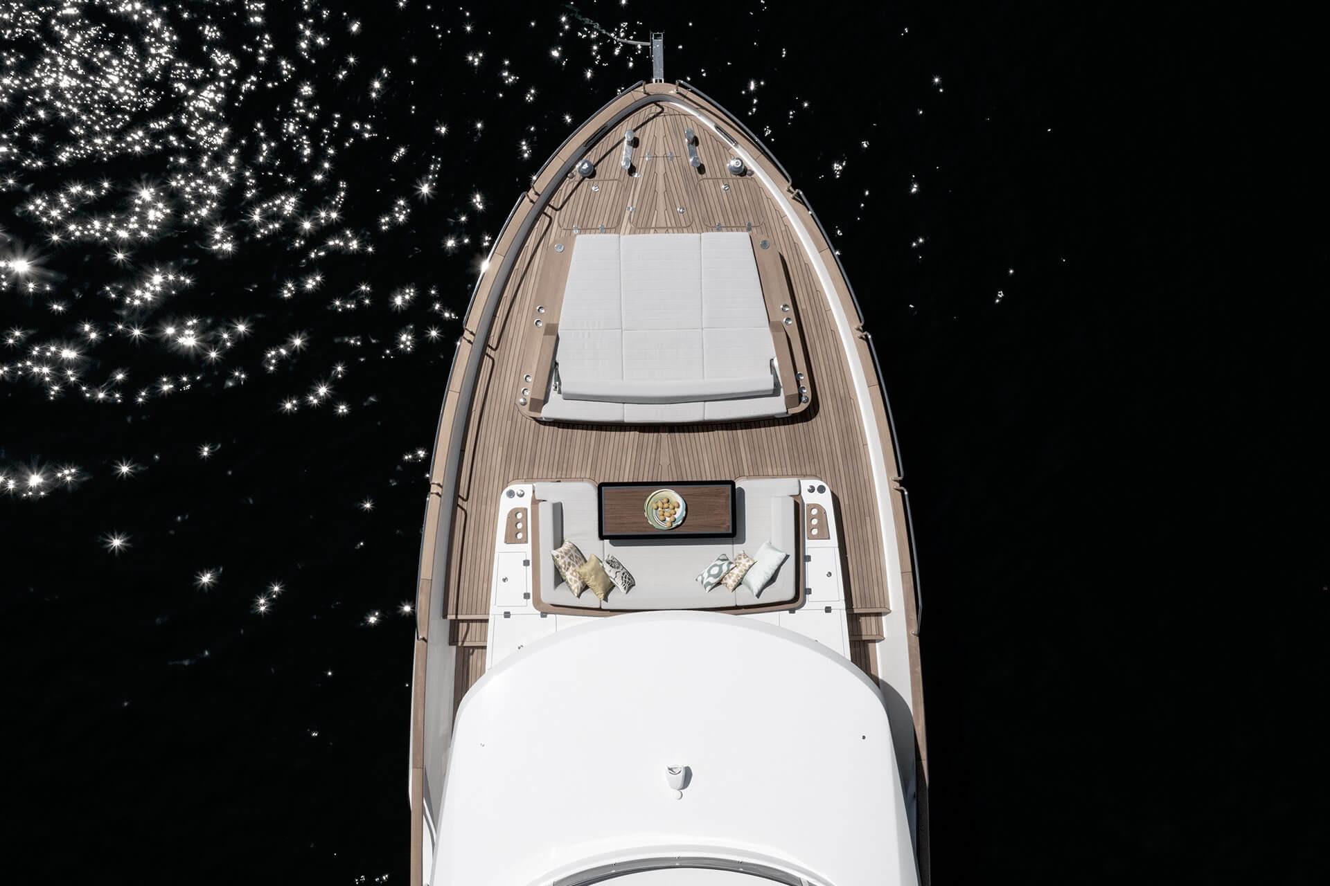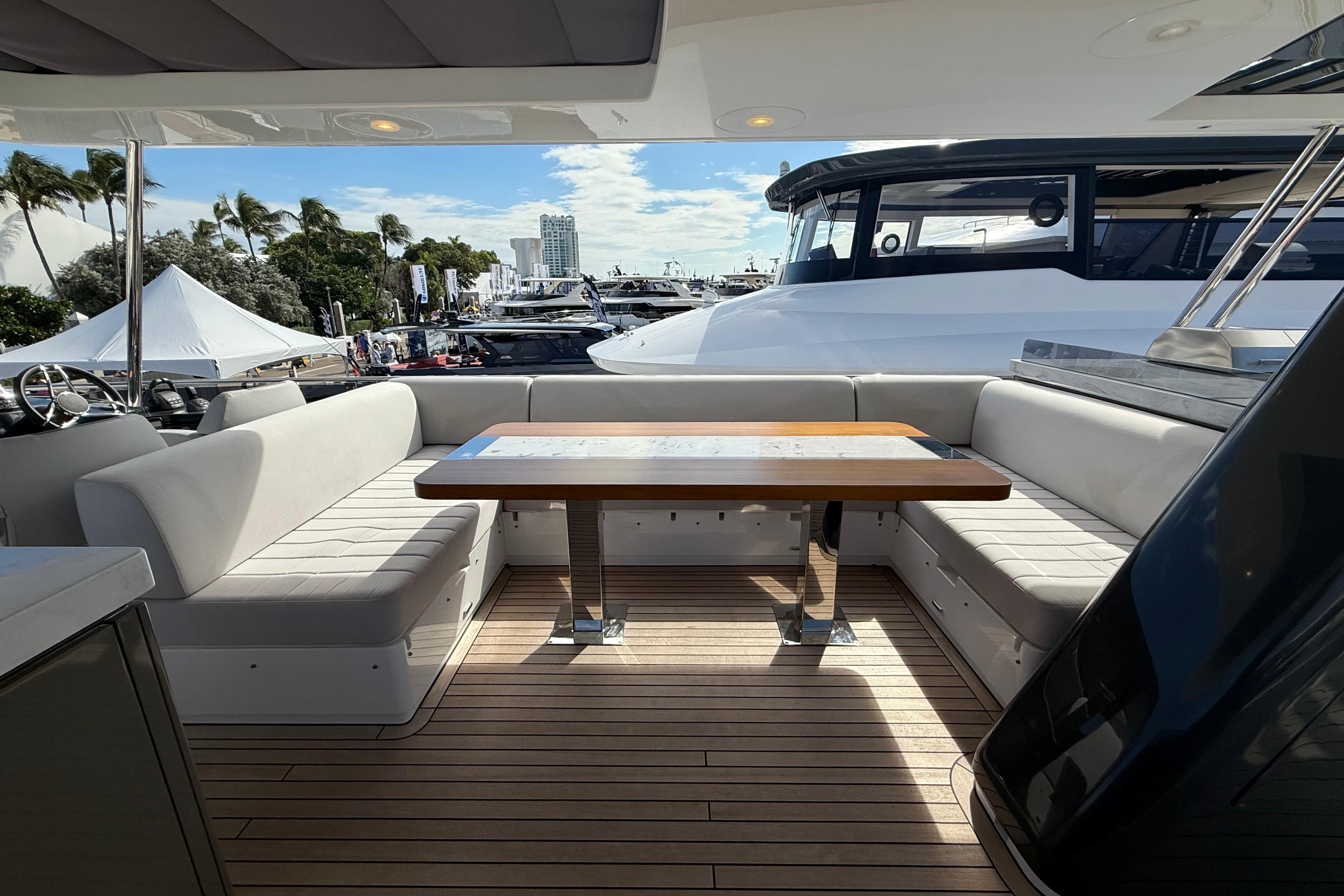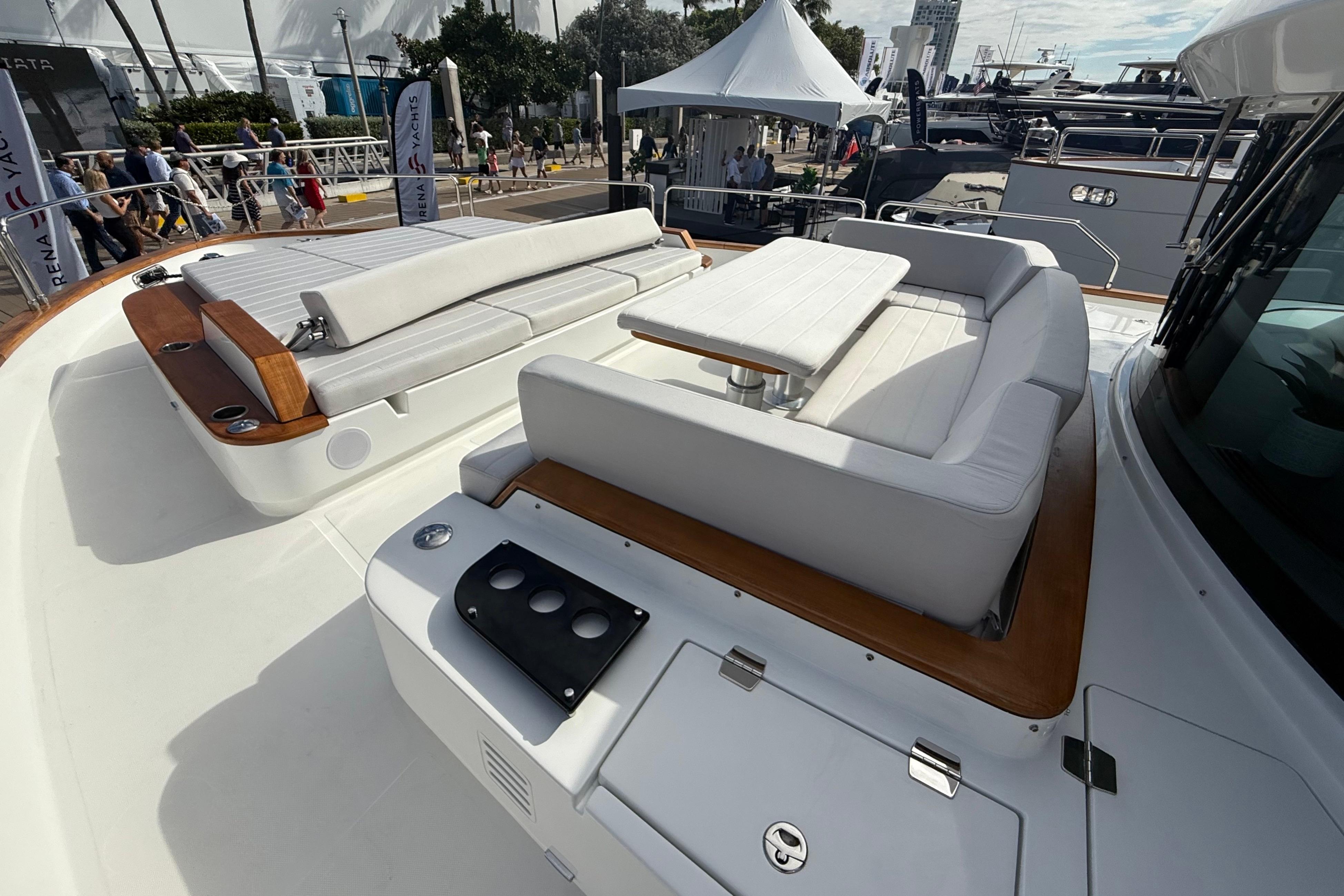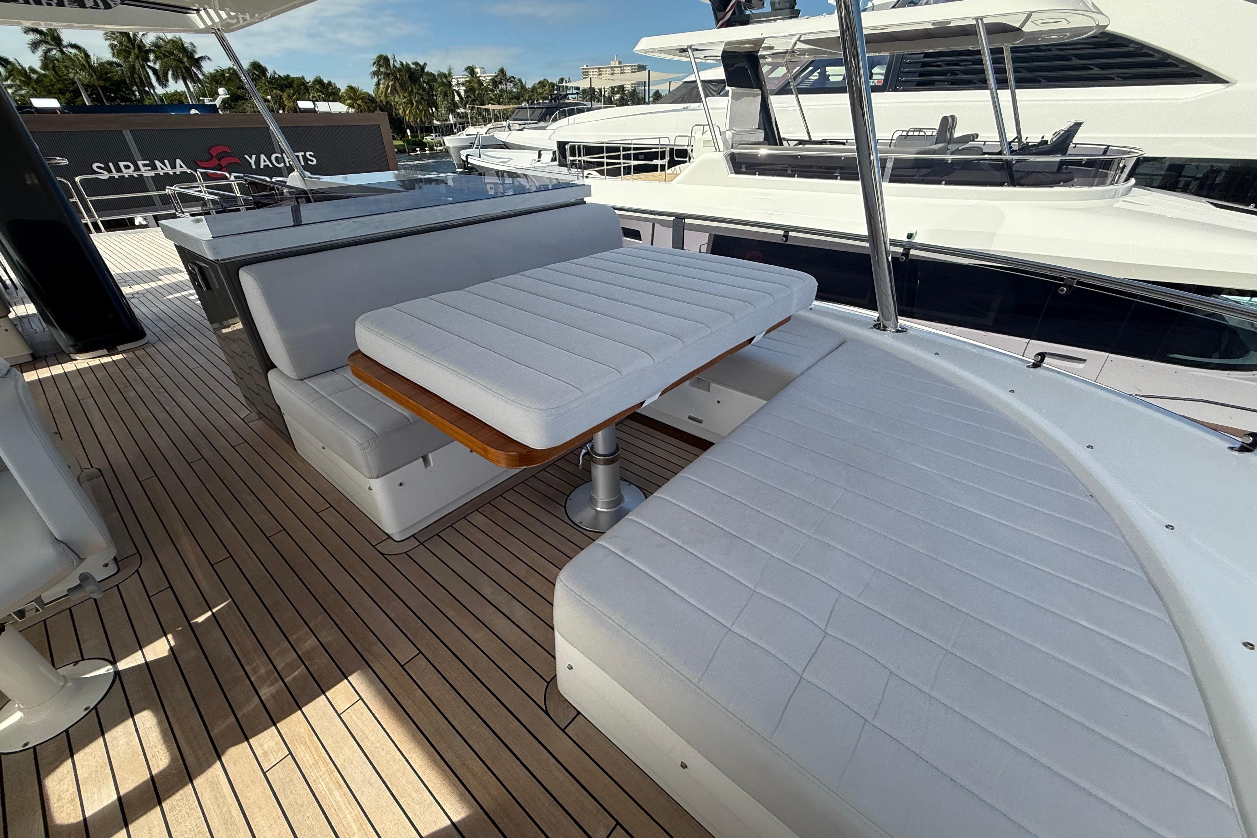 At the stern, a large hydraulic swim platform creates the perfect spot for swimming, lounging, or launching a tender. The aft deck flows naturally into the salon, making it ideal for hosting friends or relaxing with family. Up front, the foredeck offers another private space to unwind, complete with a sunpad and forward seating. The flybridge is a major highlight, extremely open, social, and versatile, with plenty of room for dining, relaxing, or taking in the views underway.