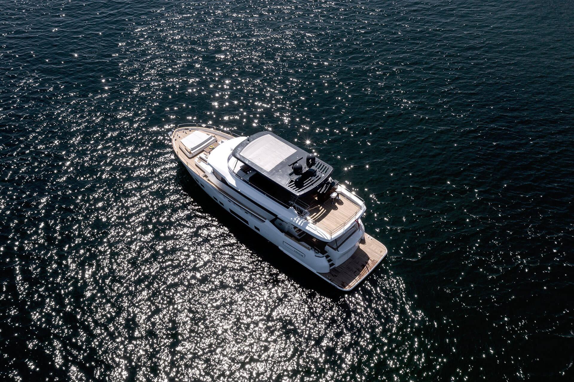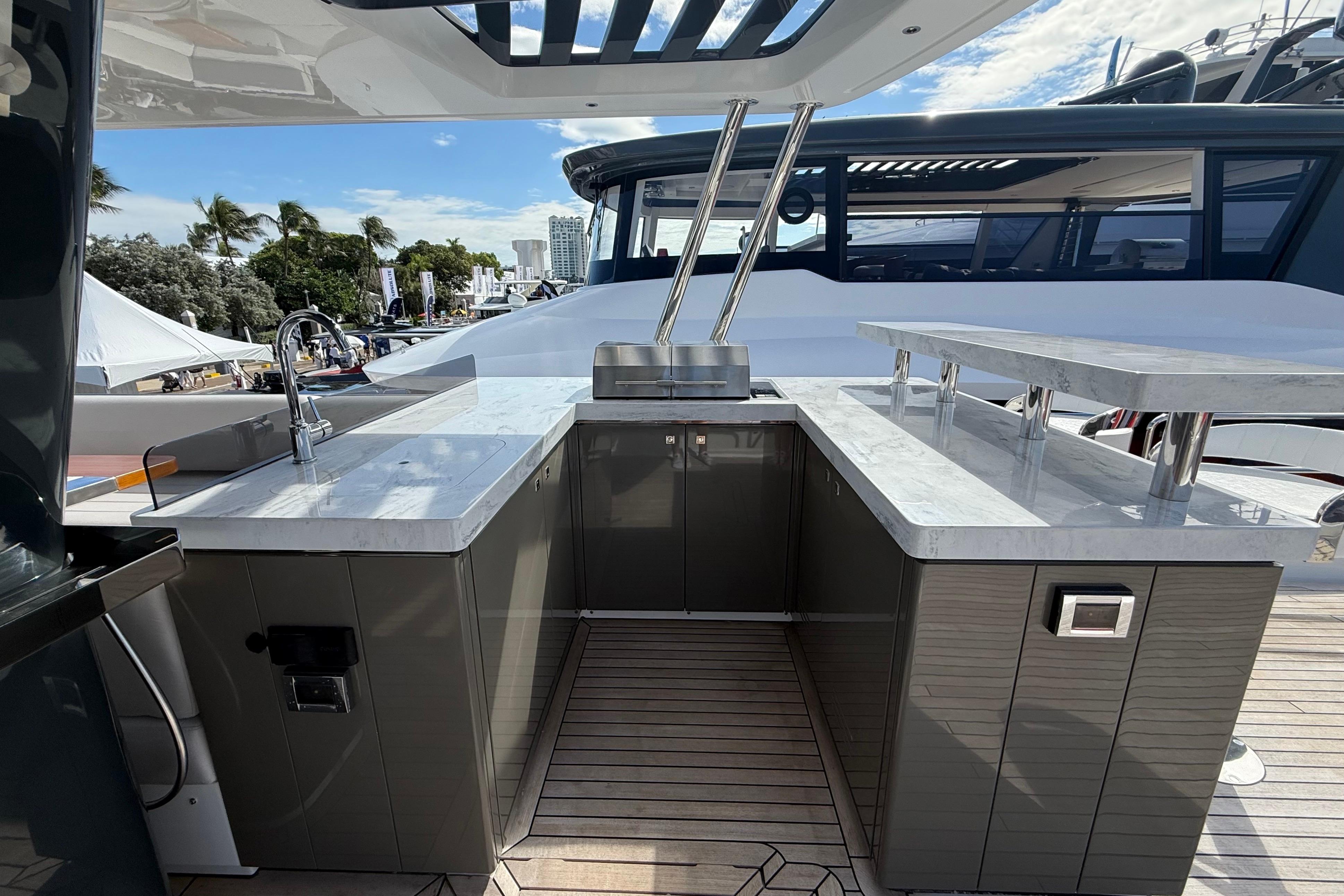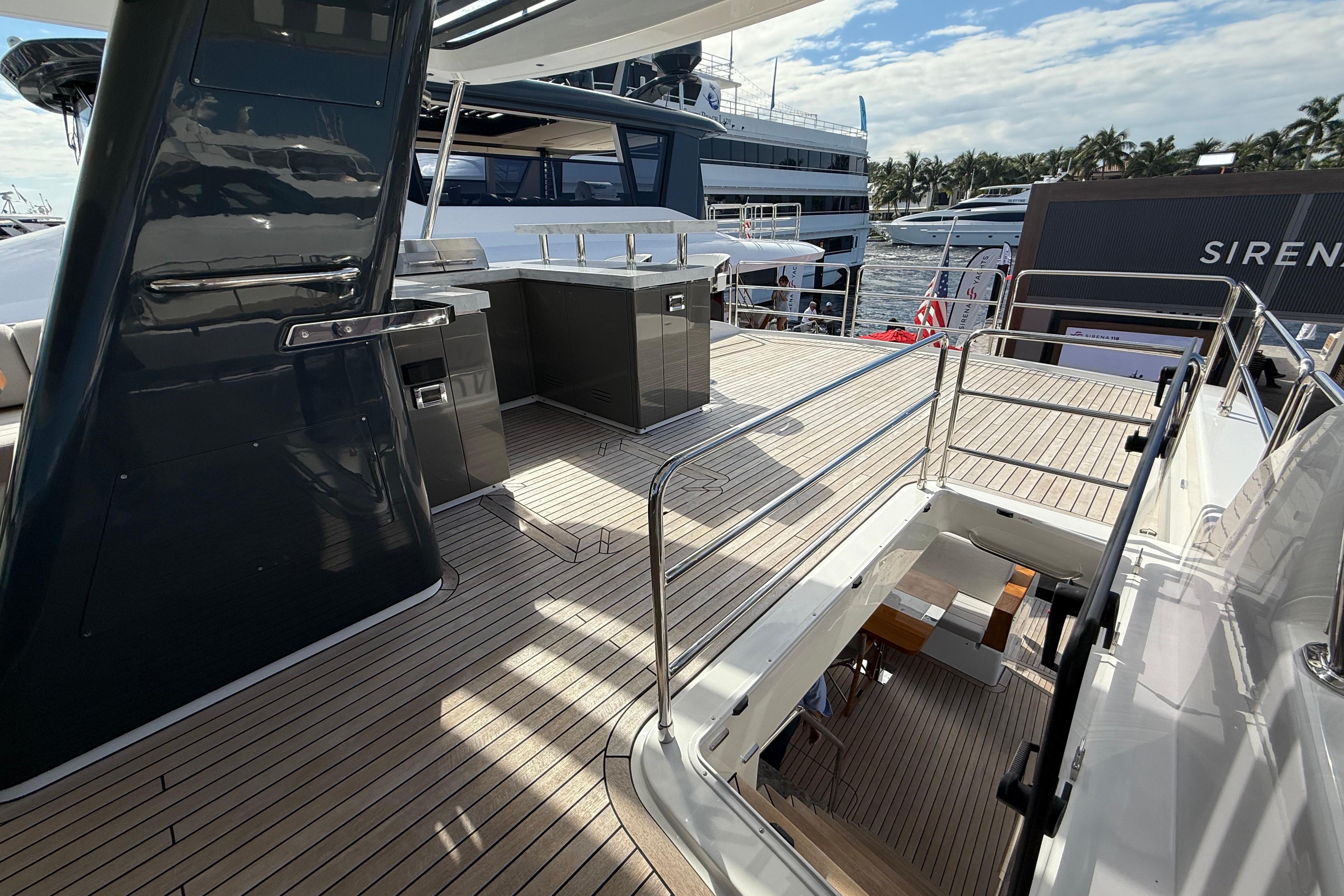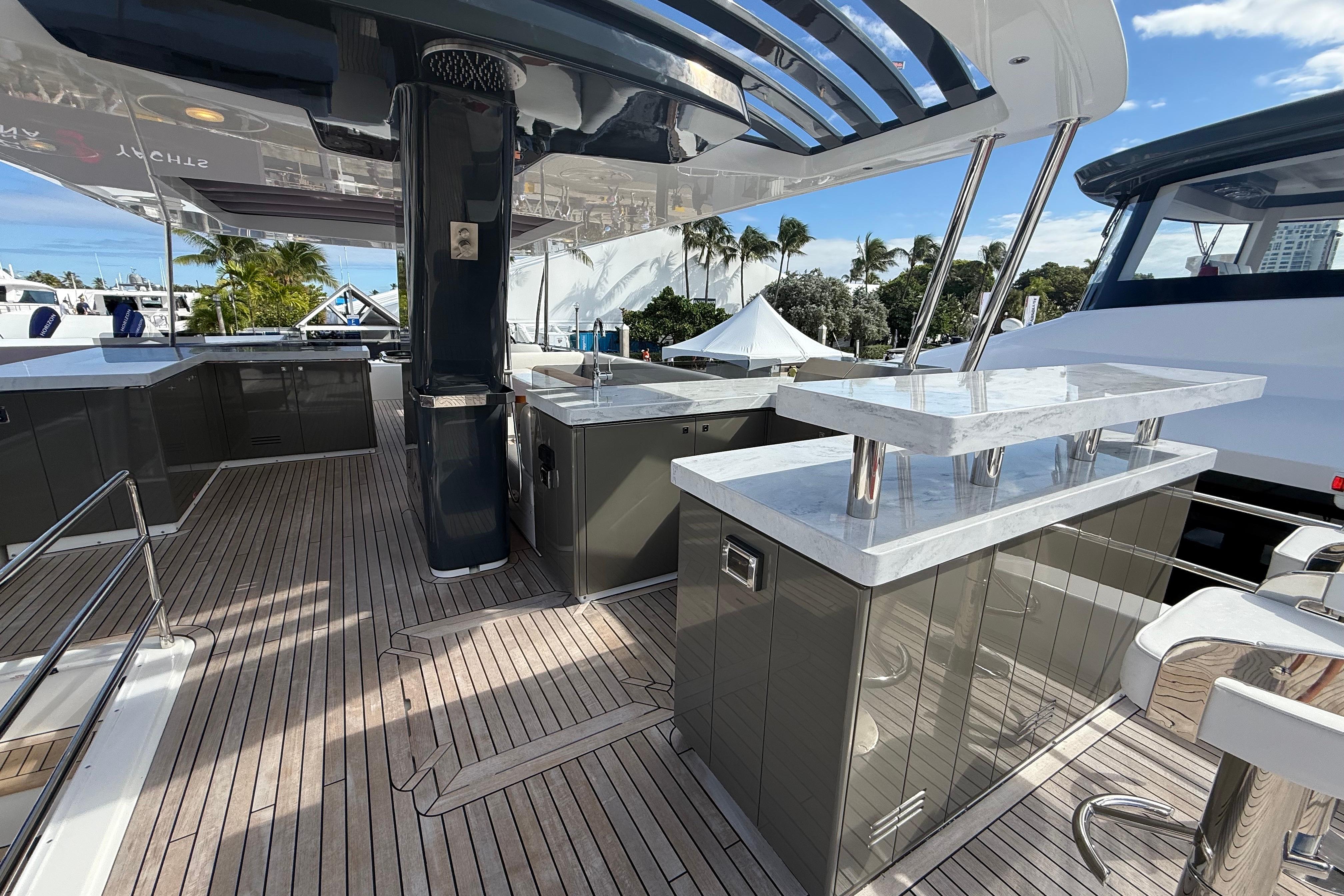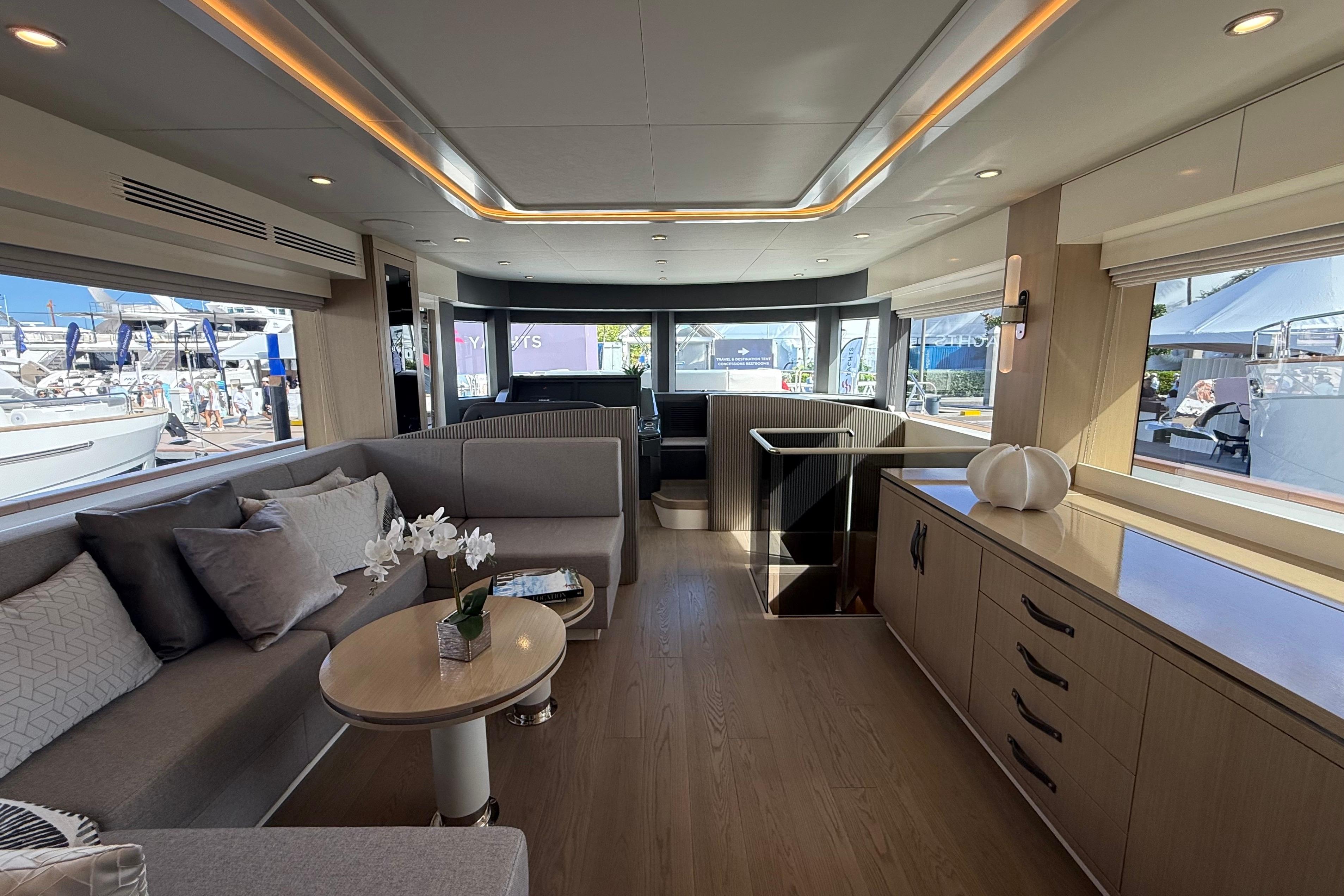 At the stern, a large hydraulic swim platform creates the perfect spot for swimming, lounging, or launching a tender. The aft deck flows naturally into the salon, making it ideal for hosting friends or relaxing with family. Up front, the foredeck offers another private space to unwind, complete with a sunpad and forward seating. The flybridge is a major highlight, extremely open, social, and versatile, with plenty of room for dining, relaxing, or taking in the views underway.