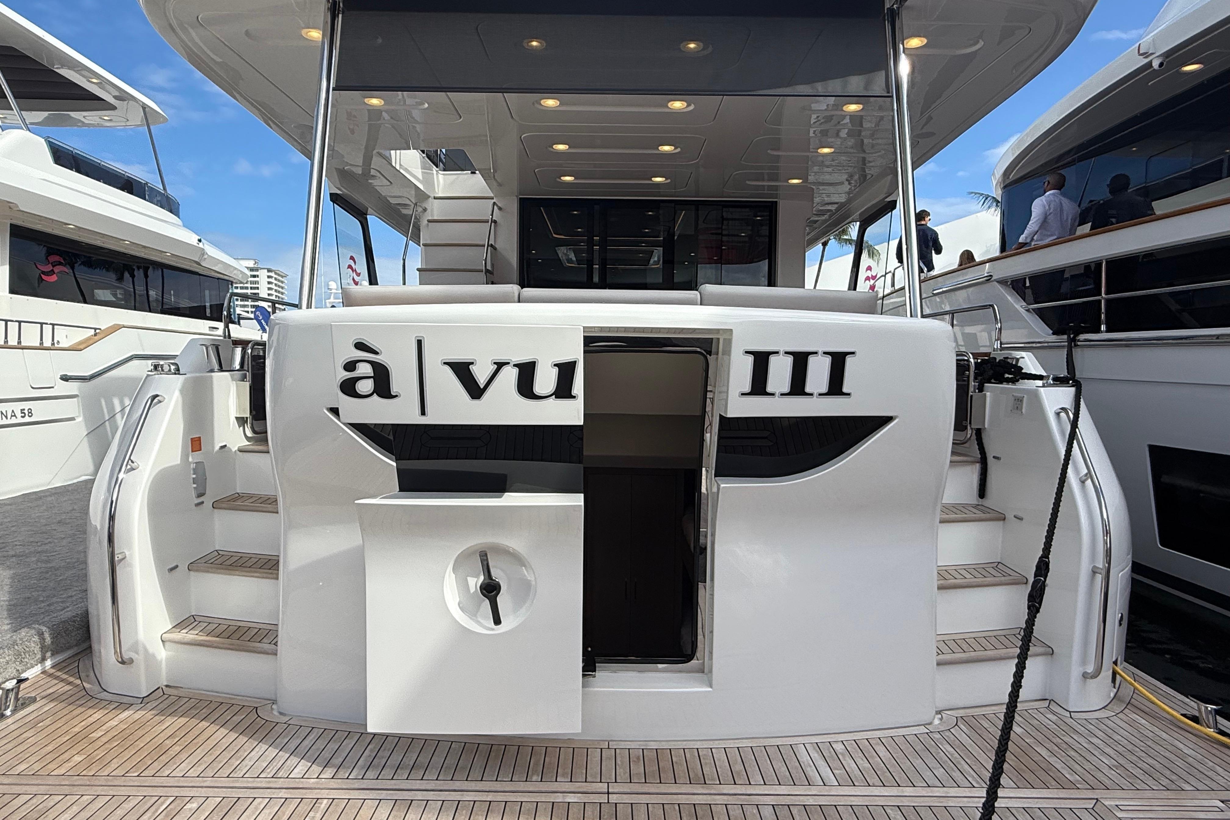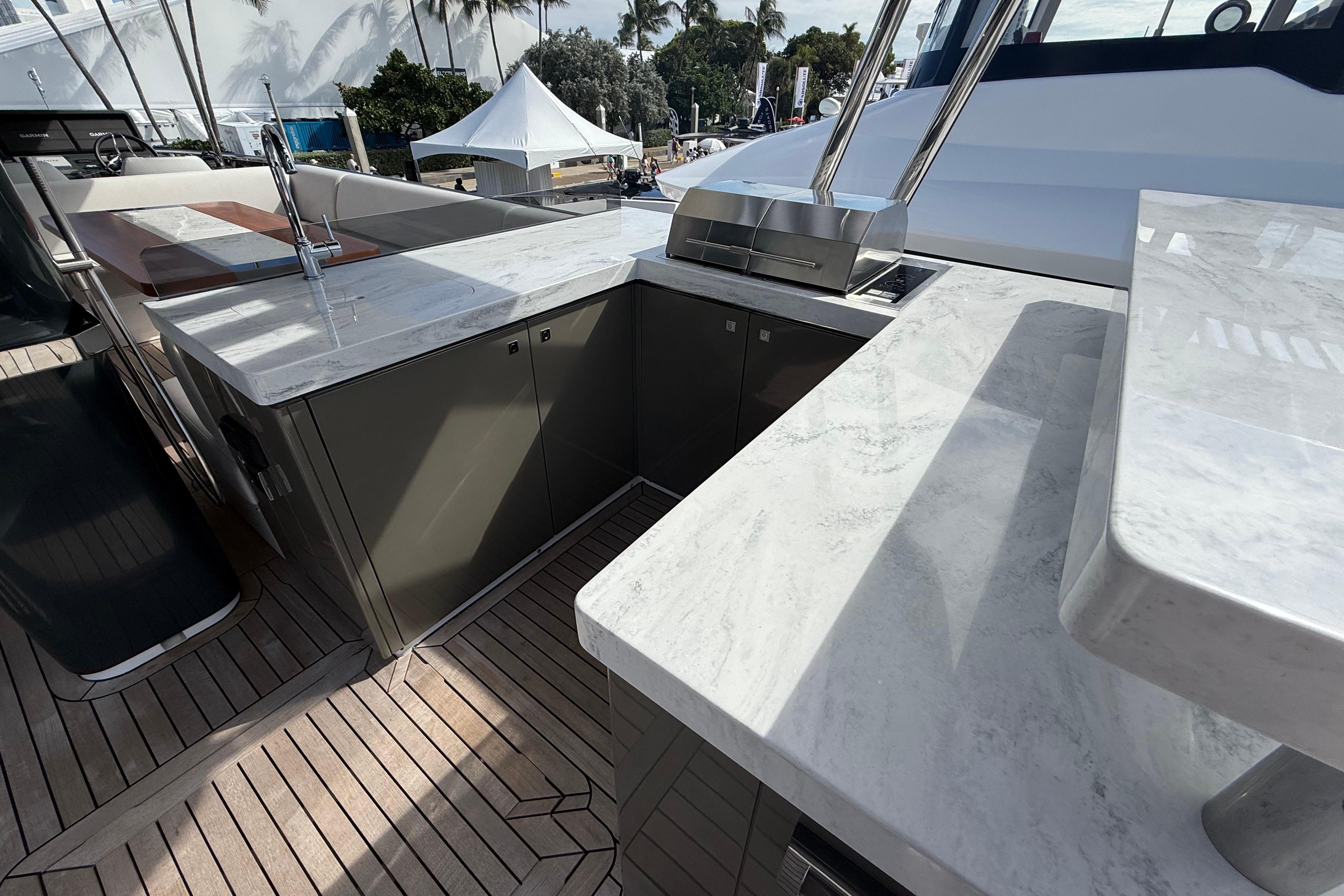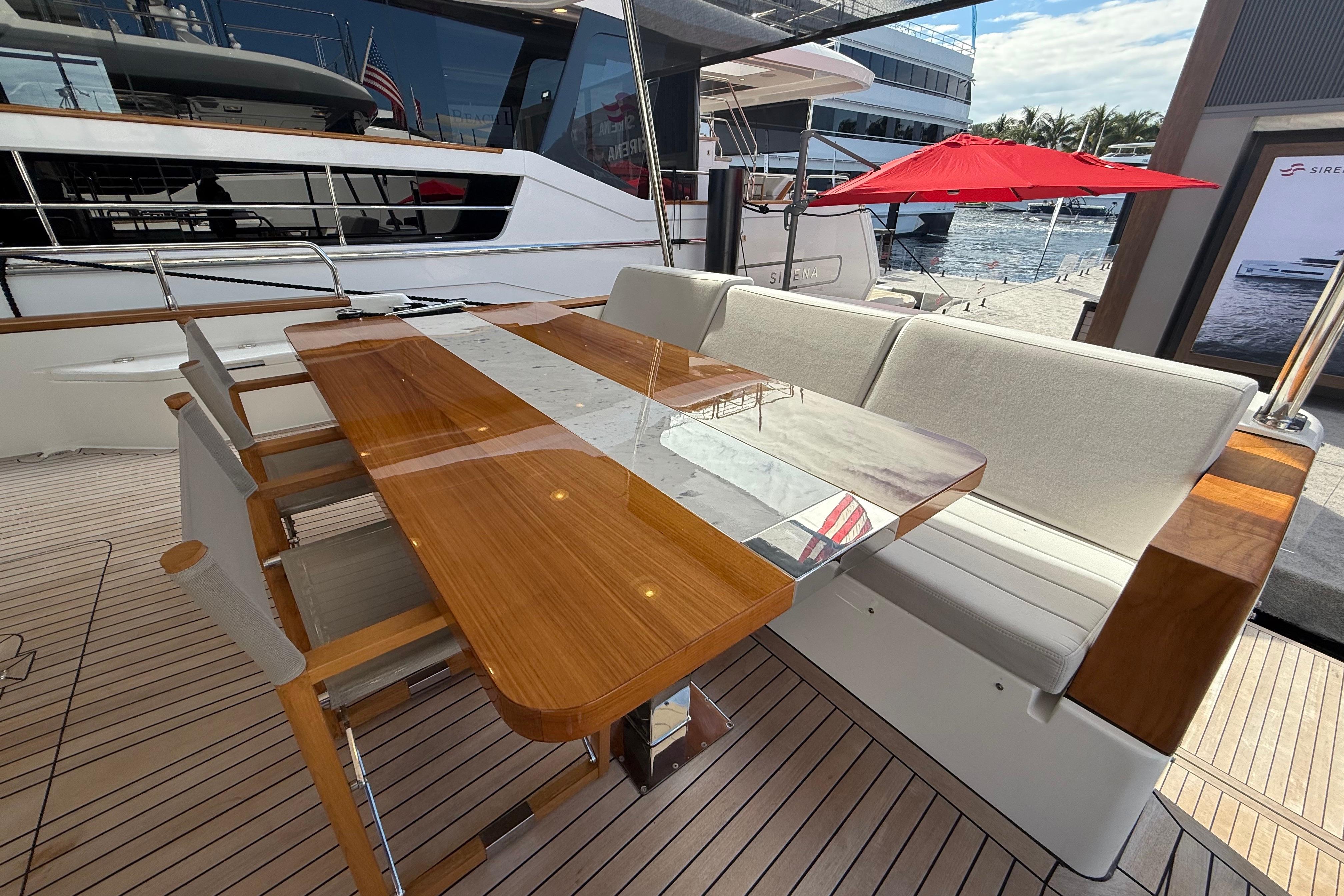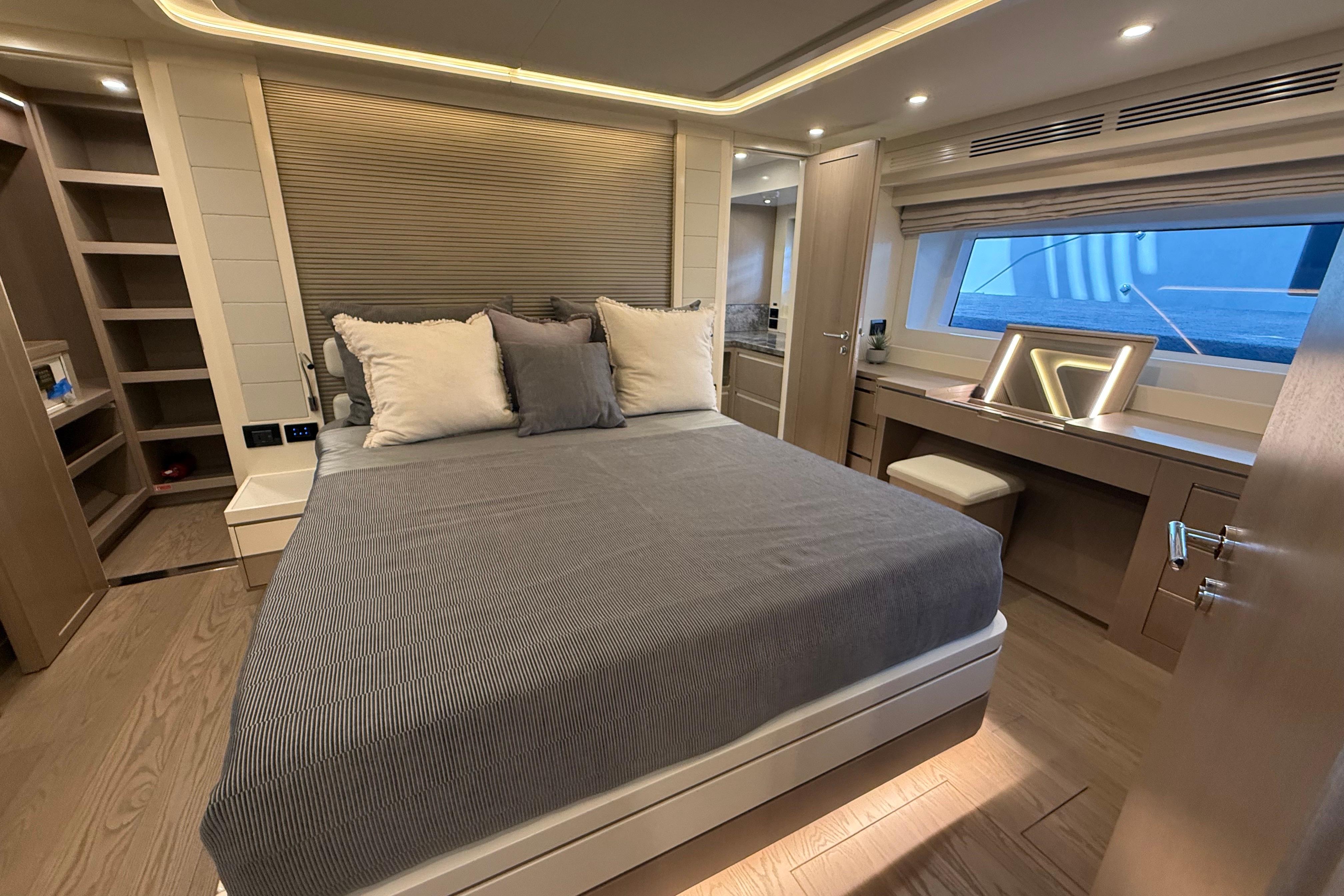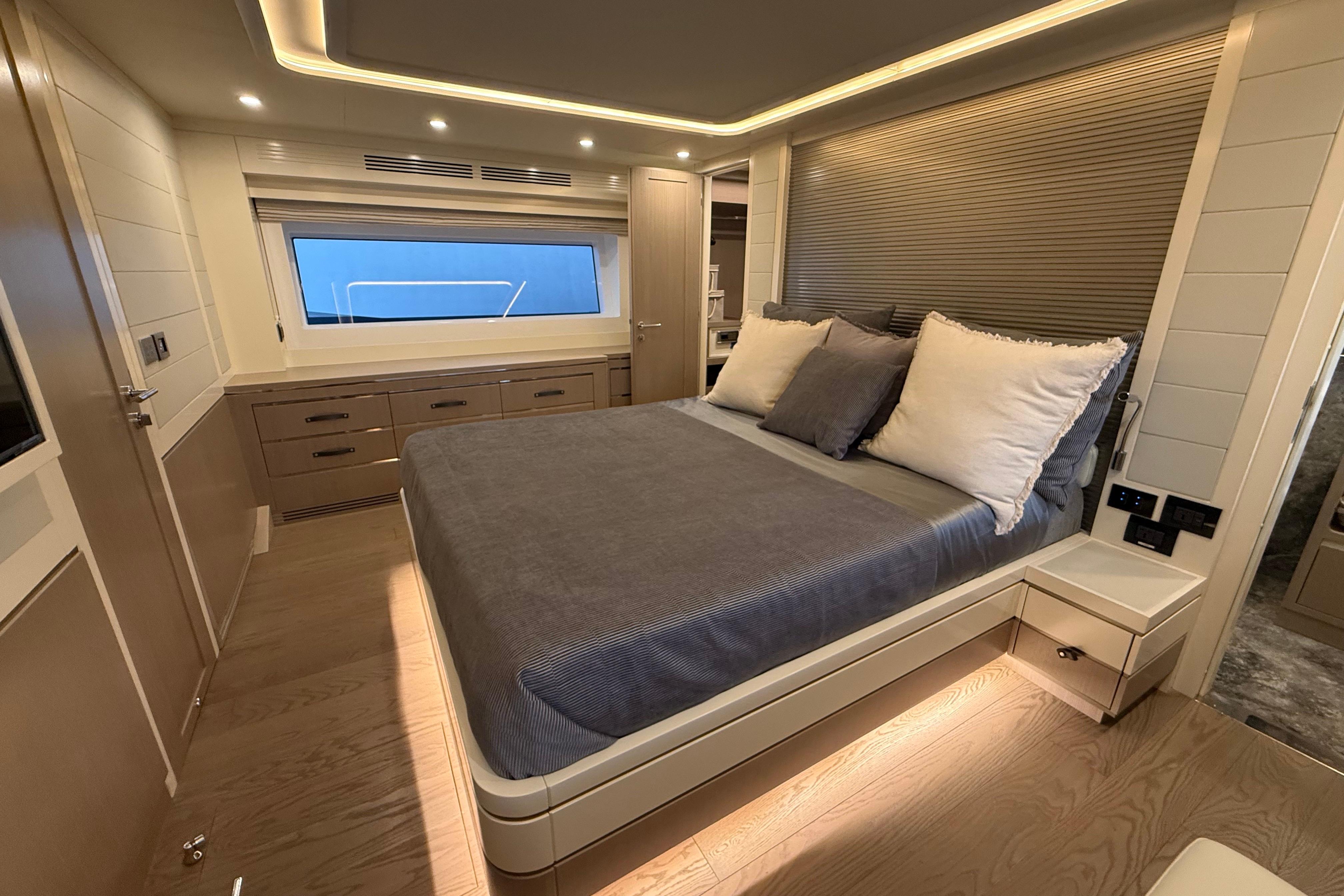 At the stern, a large hydraulic swim platform creates the perfect spot for swimming, lounging, or launching a tender. The aft deck flows naturally into the salon, making it ideal for hosting friends or relaxing with family. Up front, the foredeck offers another private space to unwind, complete with a sunpad and forward seating. The flybridge is a major highlight, extremely open, social, and versatile, with plenty of room for dining, relaxing, or taking in the views underway.