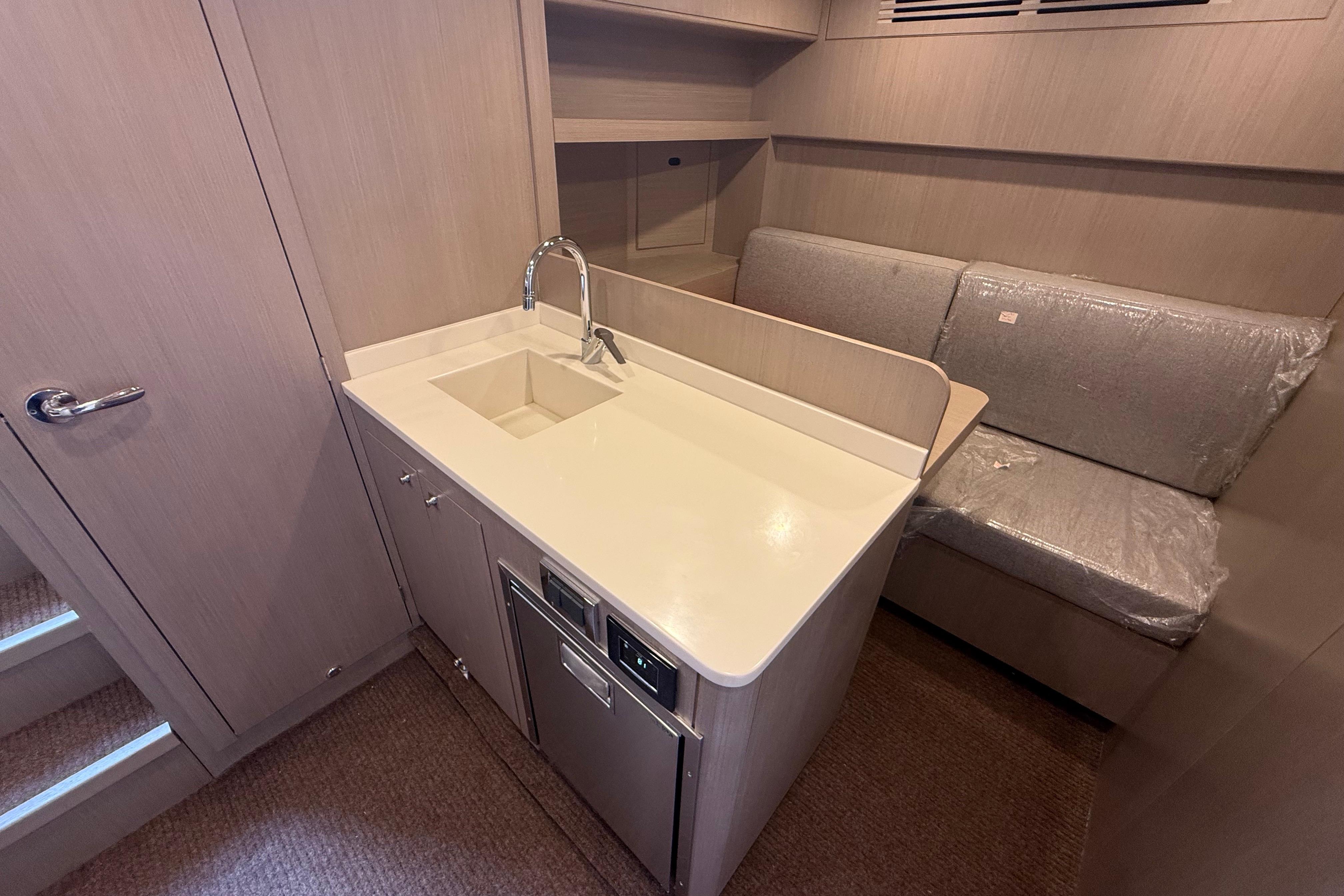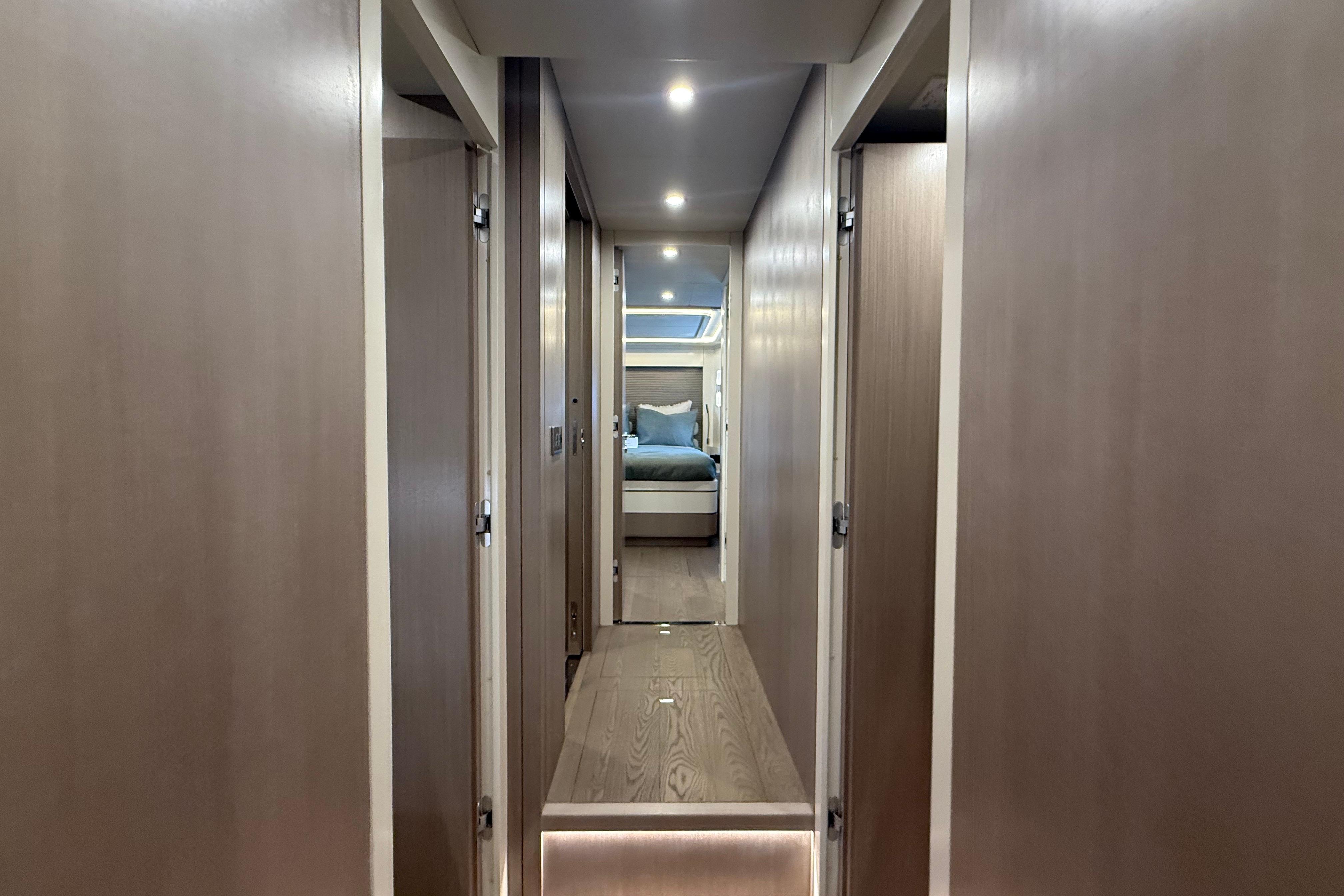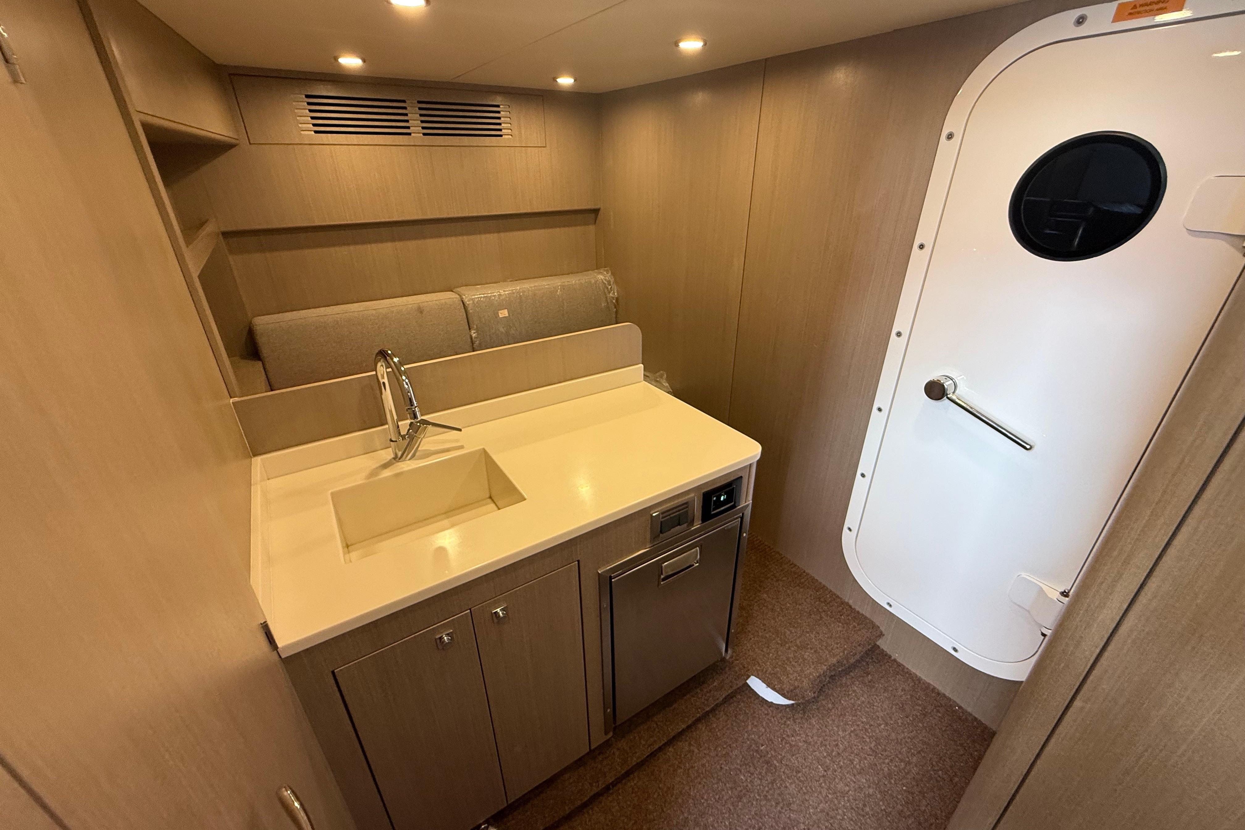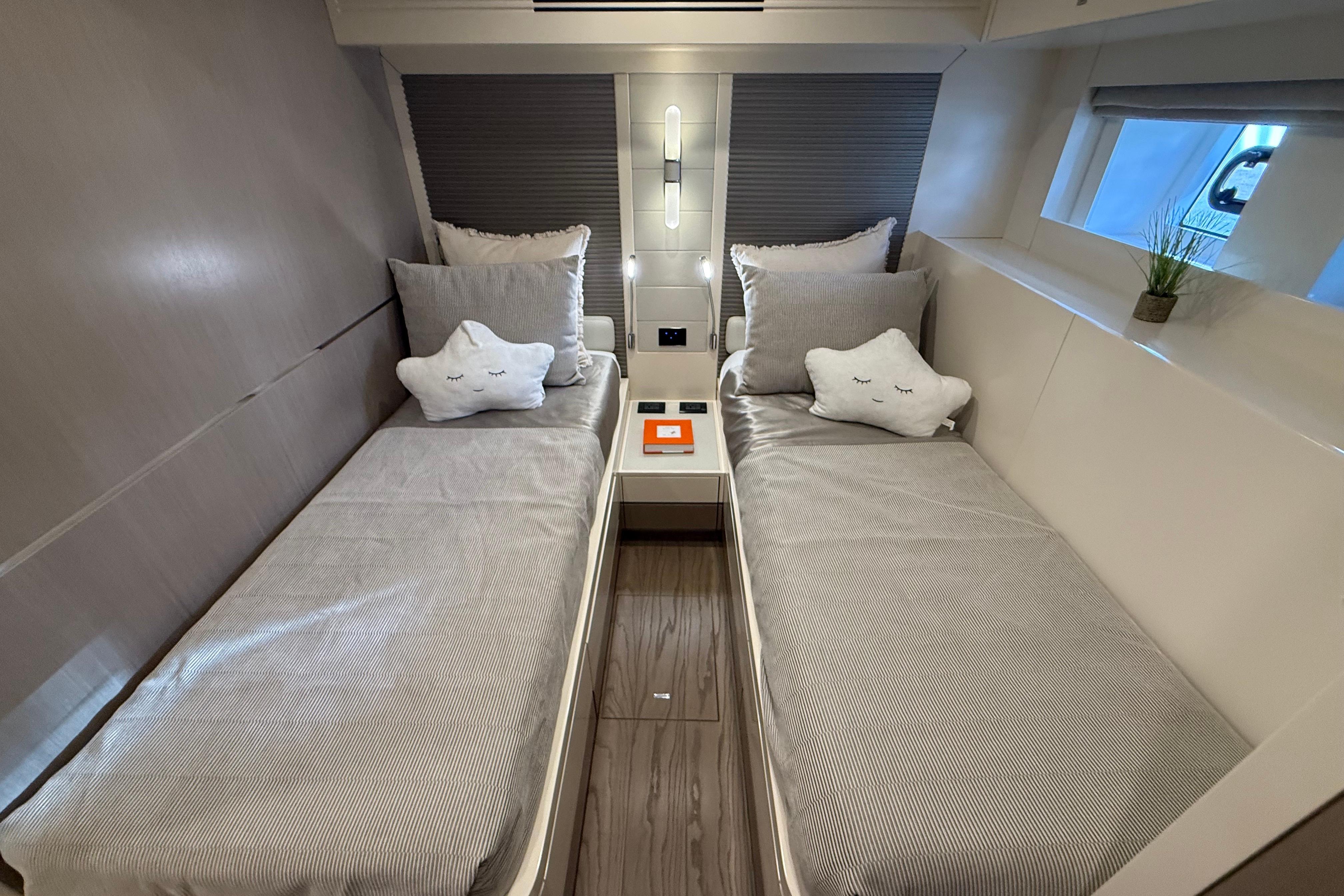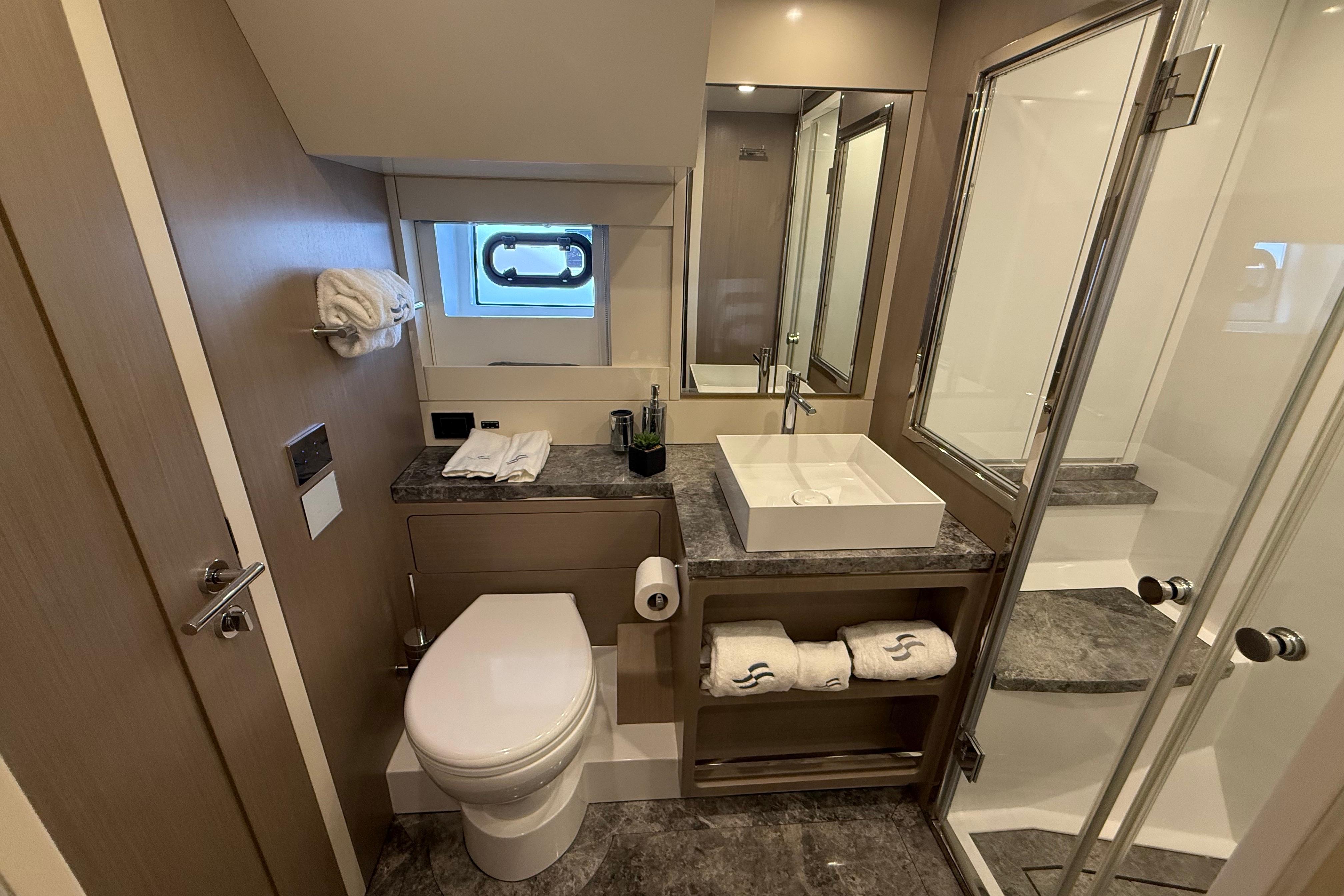 At the stern, a large hydraulic swim platform creates the perfect spot for swimming, lounging, or launching a tender. The aft deck flows naturally into the salon, making it ideal for hosting friends or relaxing with family. Up front, the foredeck offers another private space to unwind, complete with a sunpad and forward seating. The flybridge is a major highlight, extremely open, social, and versatile, with plenty of room for dining, relaxing, or taking in the views underway.