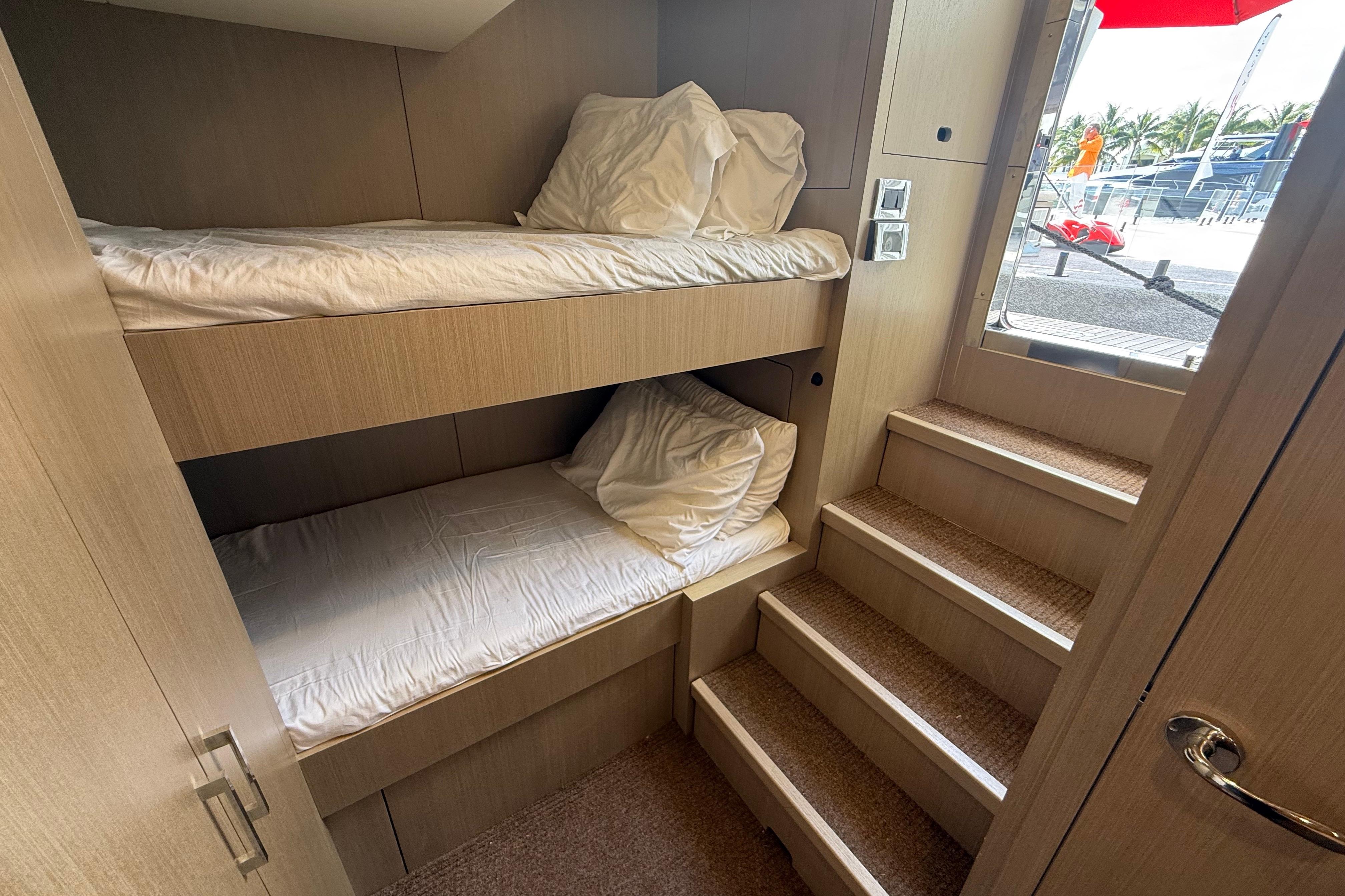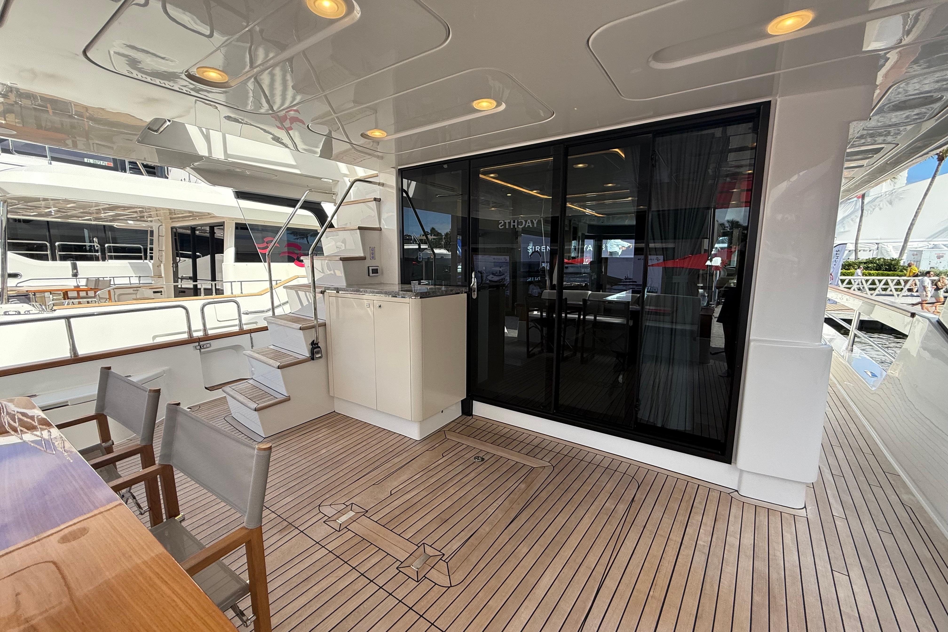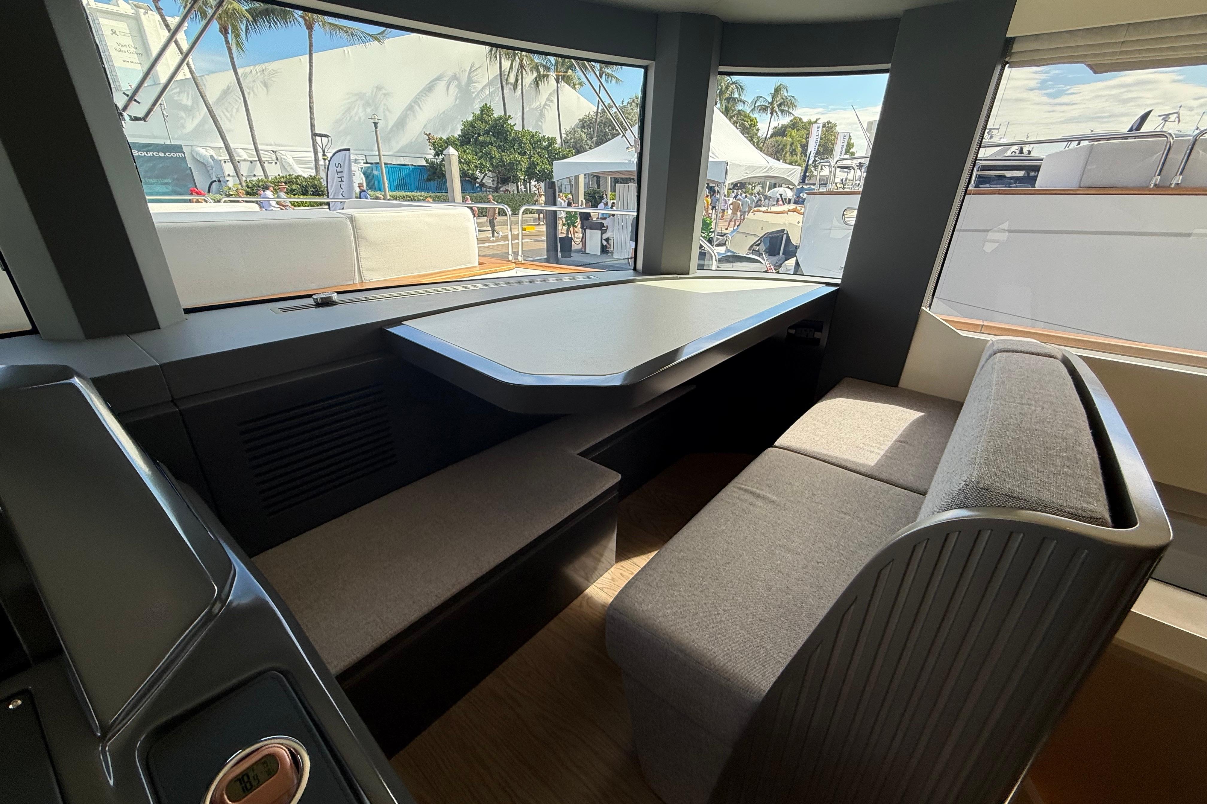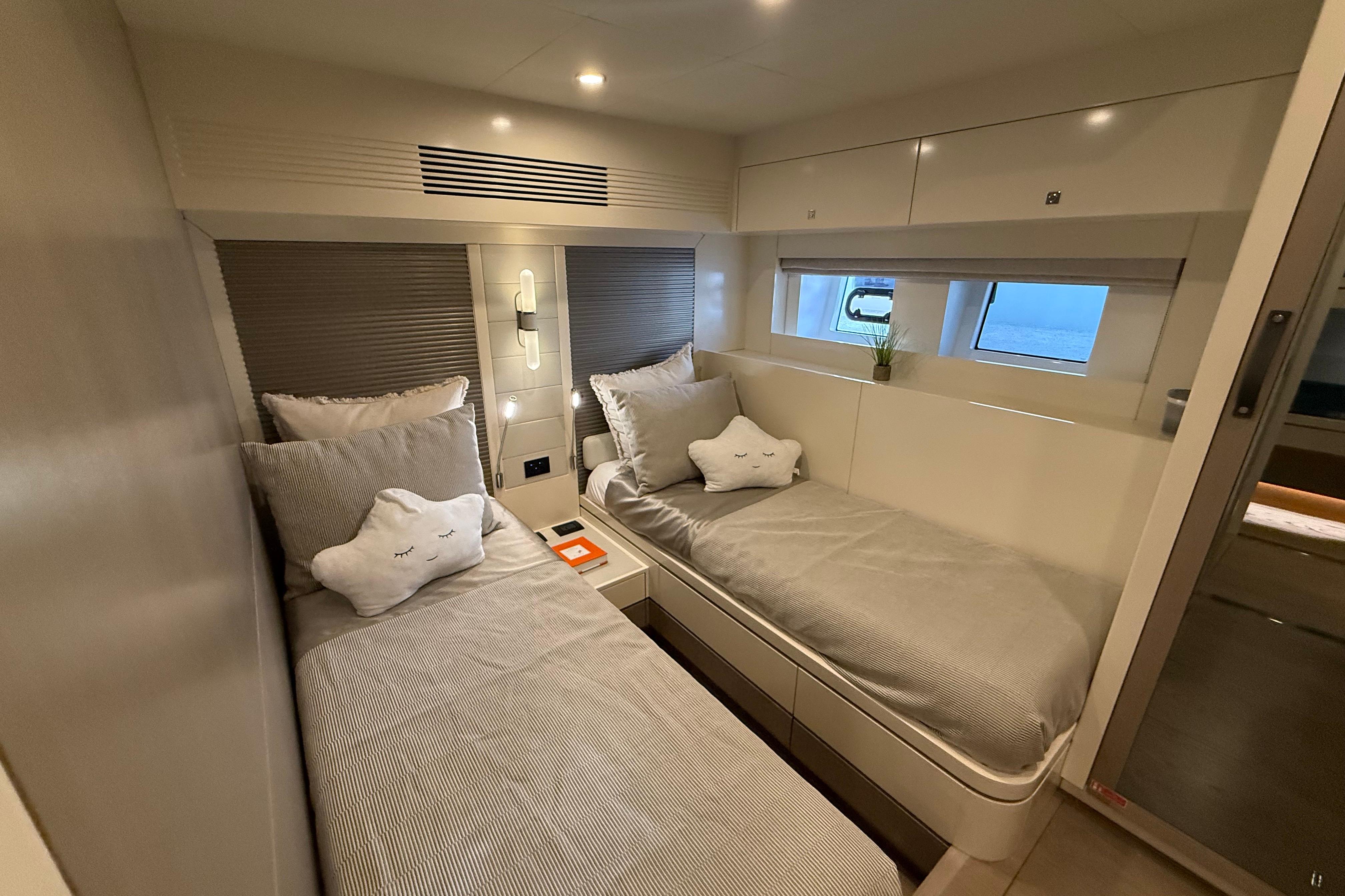 At the stern, a large hydraulic swim platform creates the perfect spot for swimming, lounging, or launching a tender. The aft deck flows naturally into the salon, making it ideal for hosting friends or relaxing with family. Up front, the foredeck offers another private space to unwind, complete with a sunpad and forward seating. The flybridge is a major highlight, extremely open, social, and versatile, with plenty of room for dining, relaxing, or taking in the views underway.