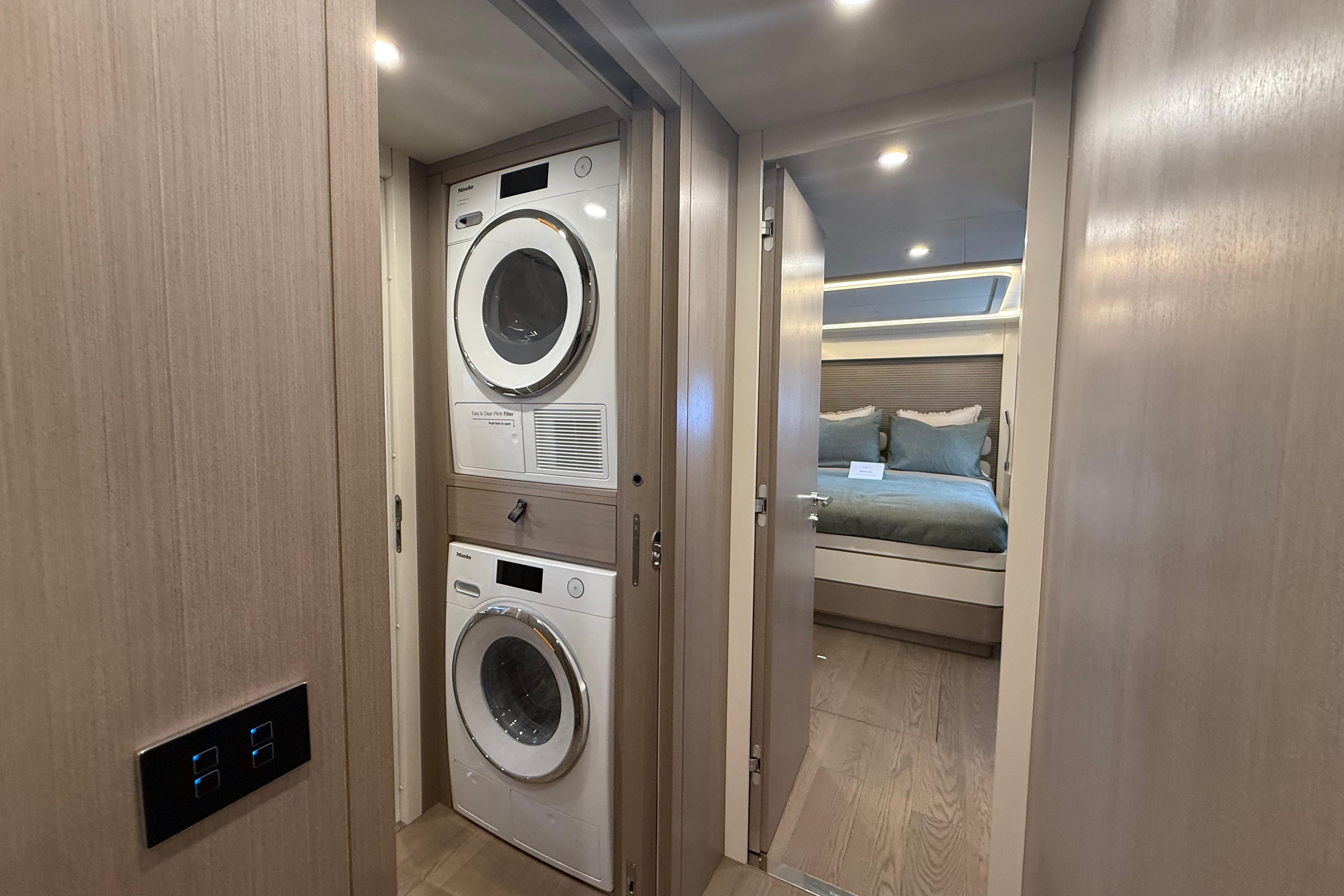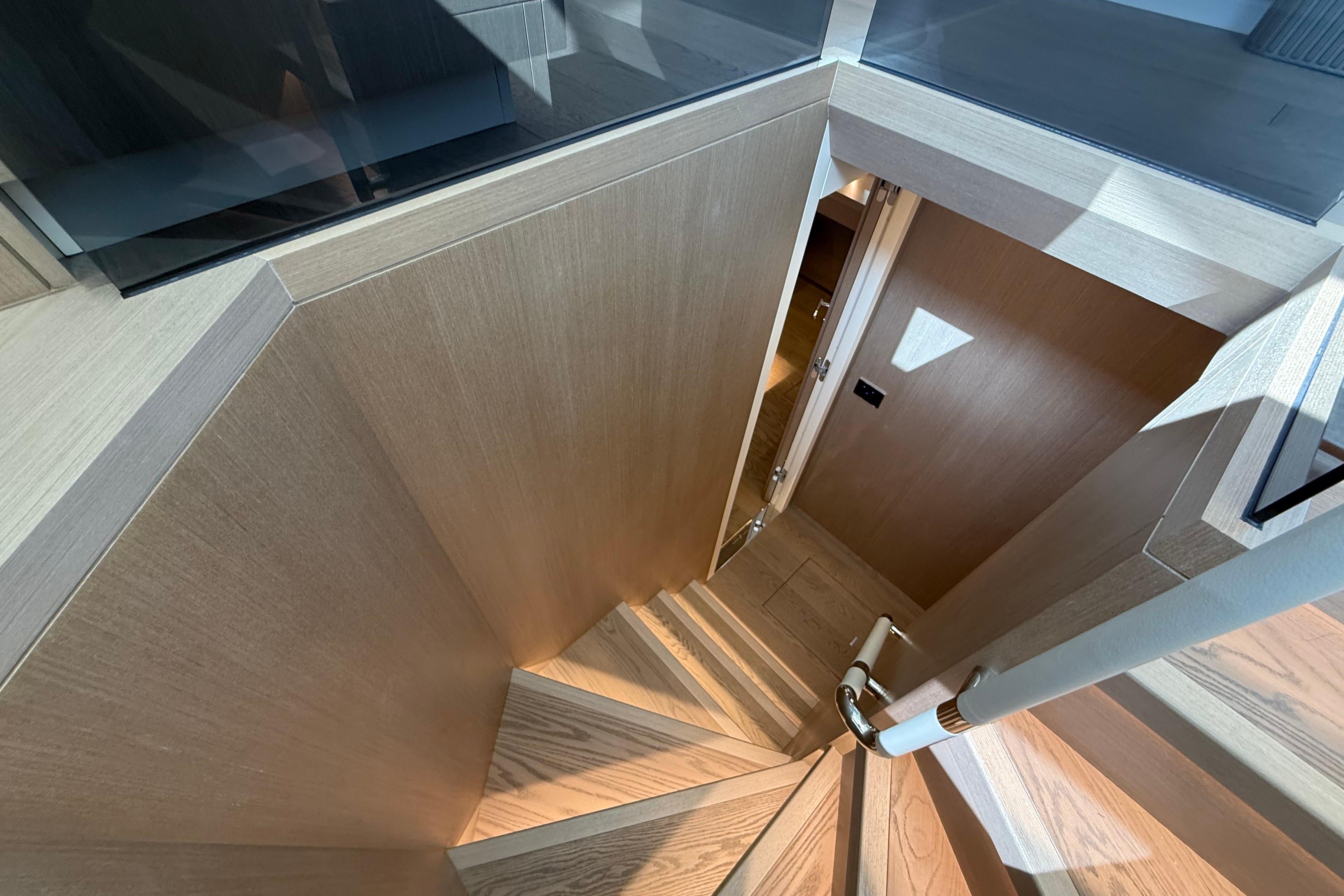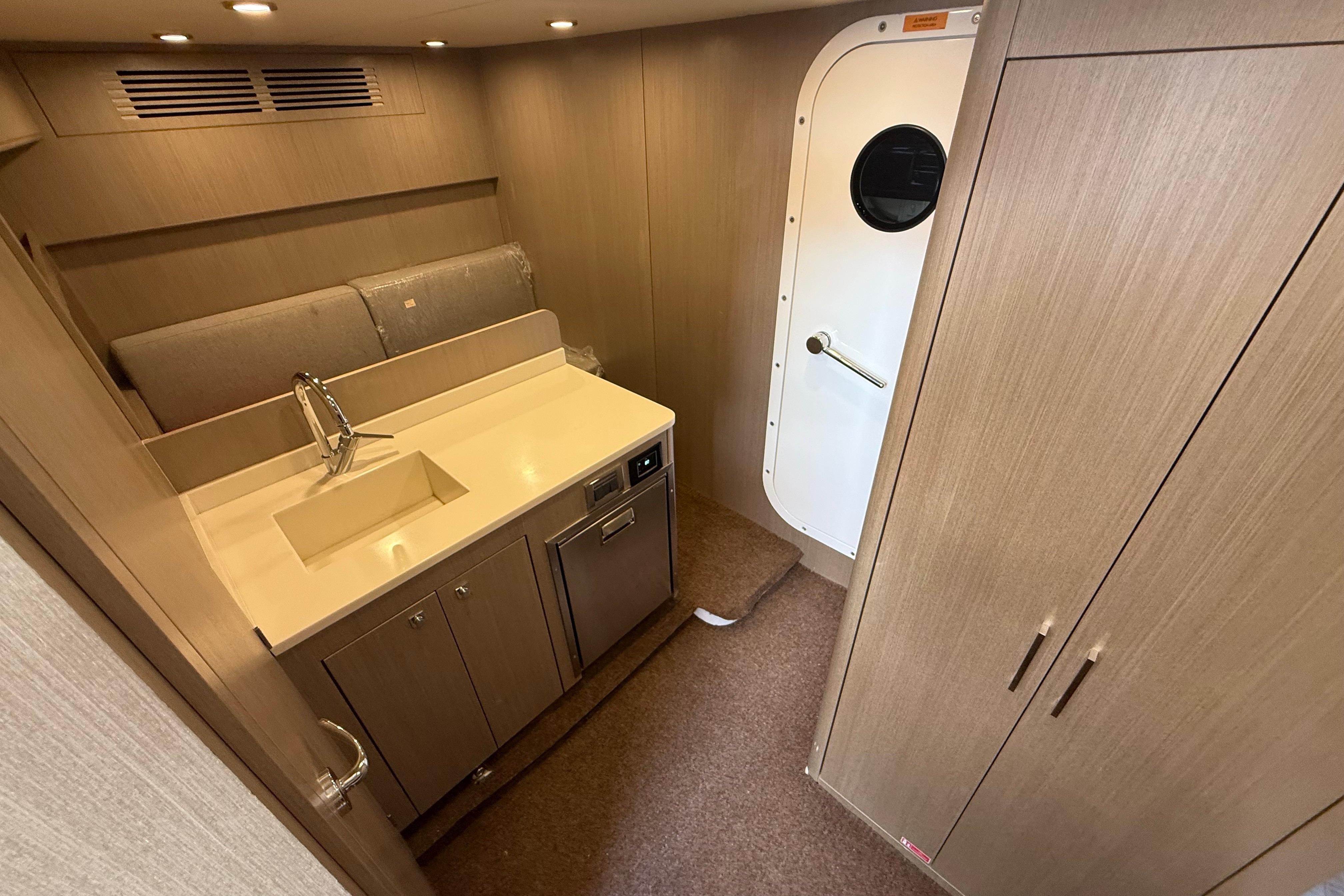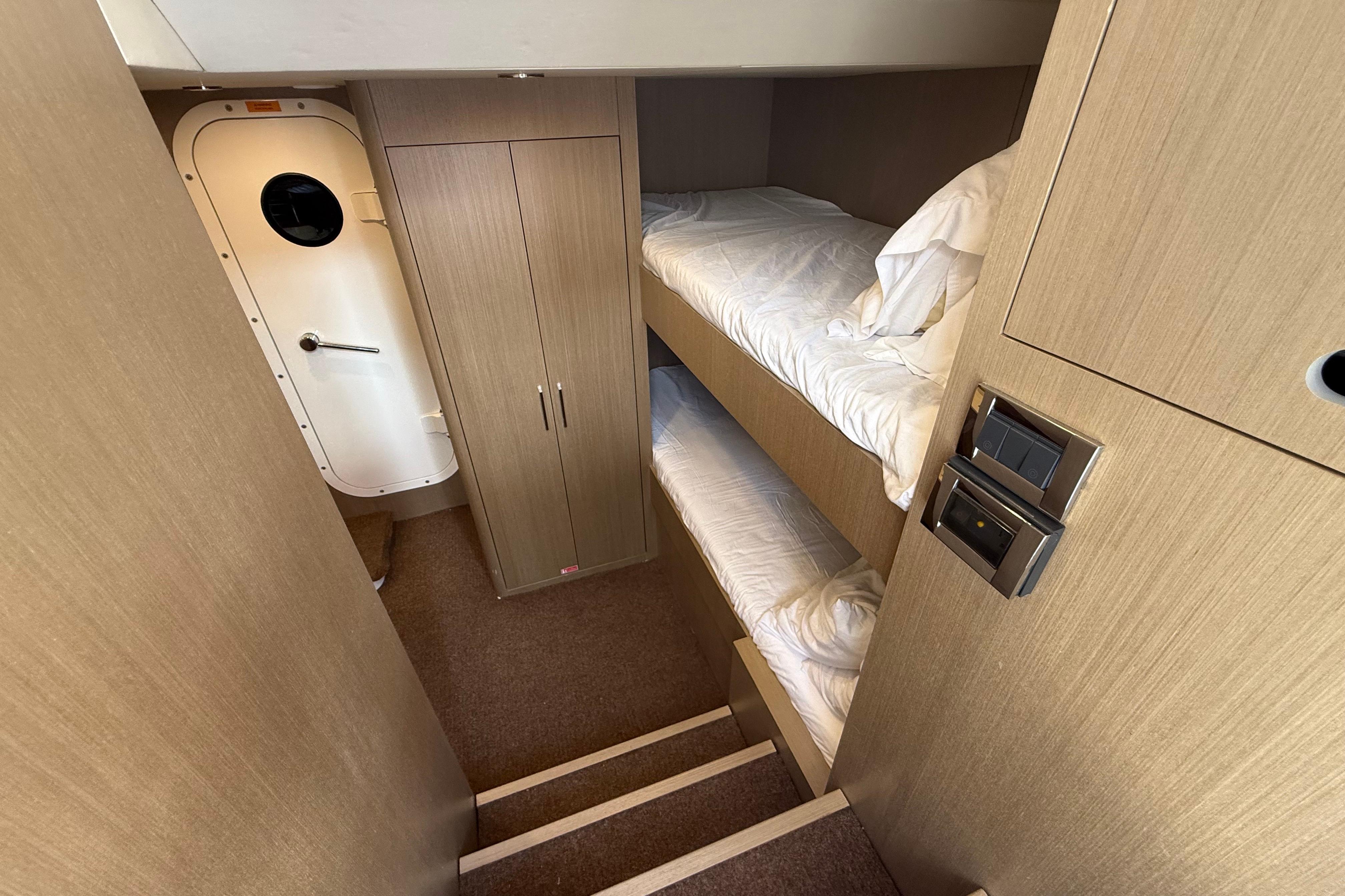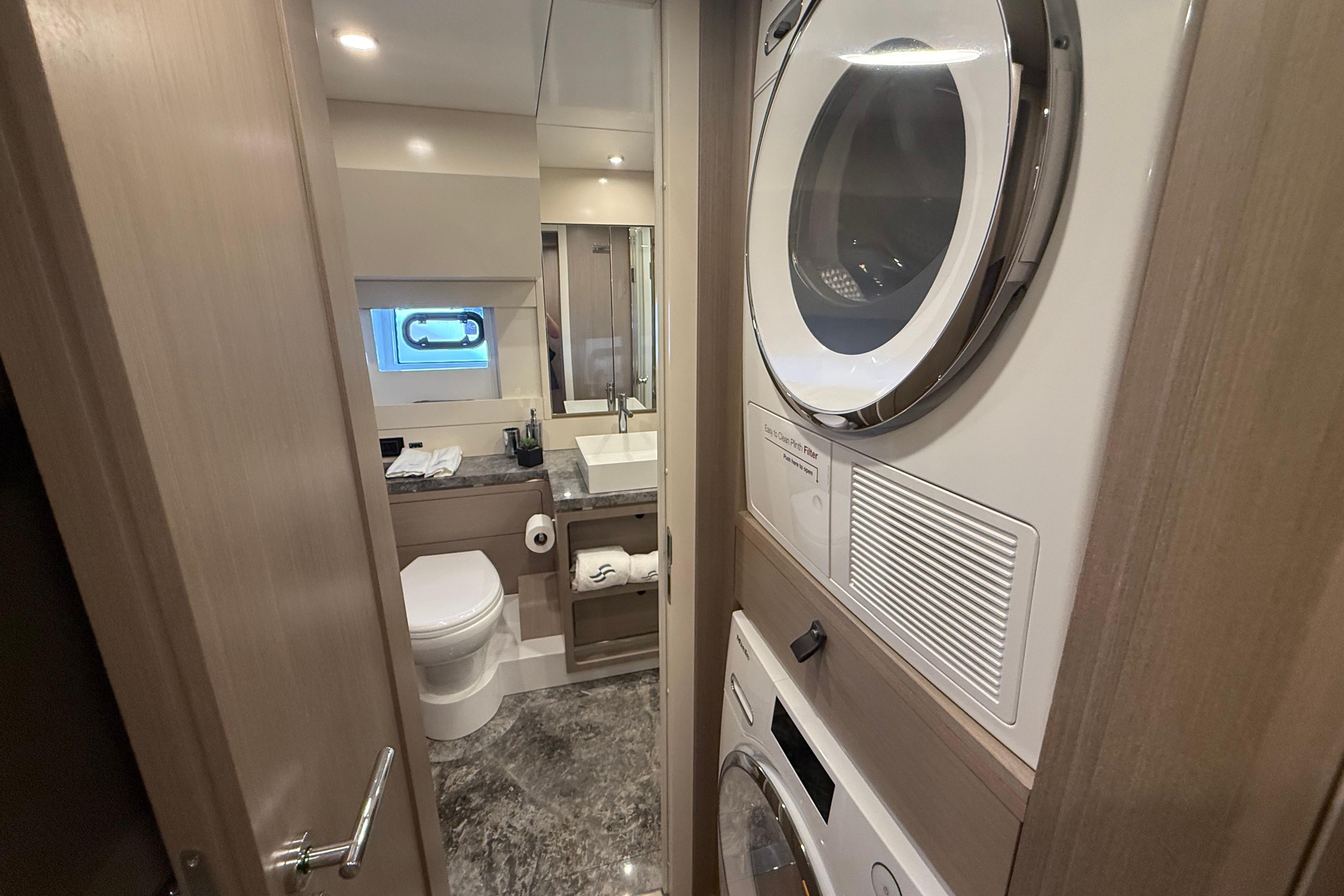 At the stern, a large hydraulic swim platform creates the perfect spot for swimming, lounging, or launching a tender. The aft deck flows naturally into the salon, making it ideal for hosting friends or relaxing with family. Up front, the foredeck offers another private space to unwind, complete with a sunpad and forward seating. The flybridge is a major highlight, extremely open, social, and versatile, with plenty of room for dining, relaxing, or taking in the views underway.