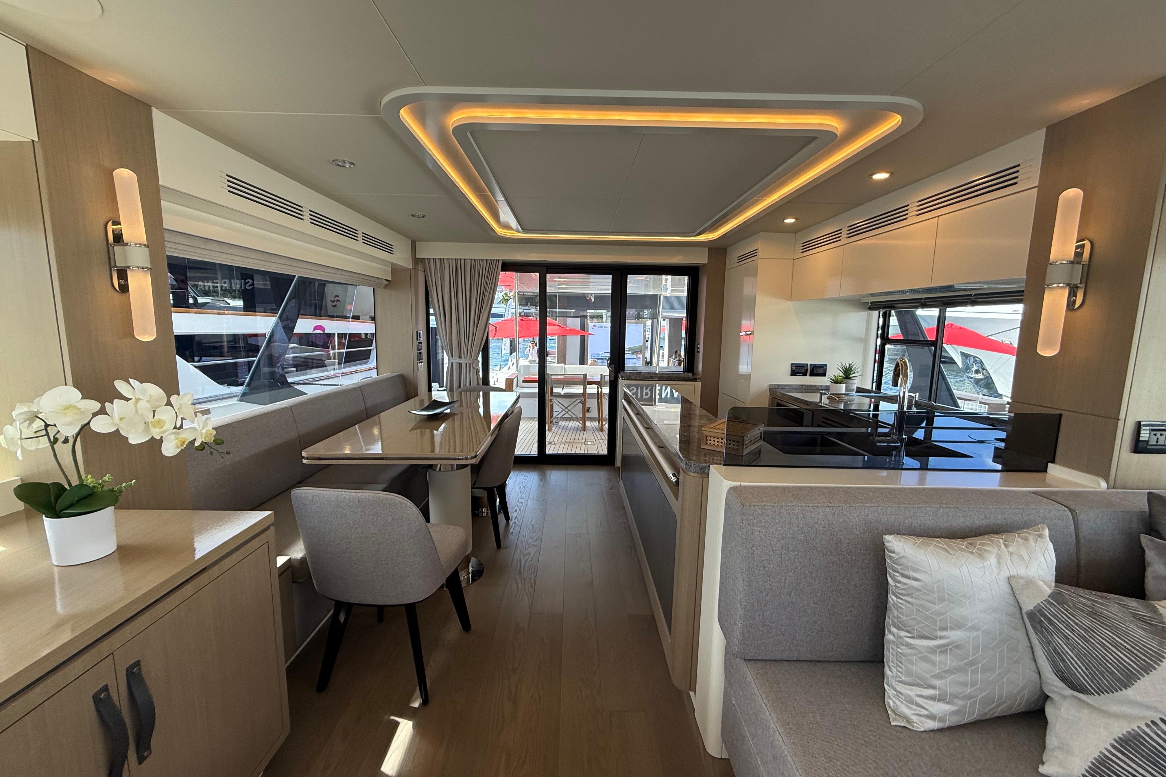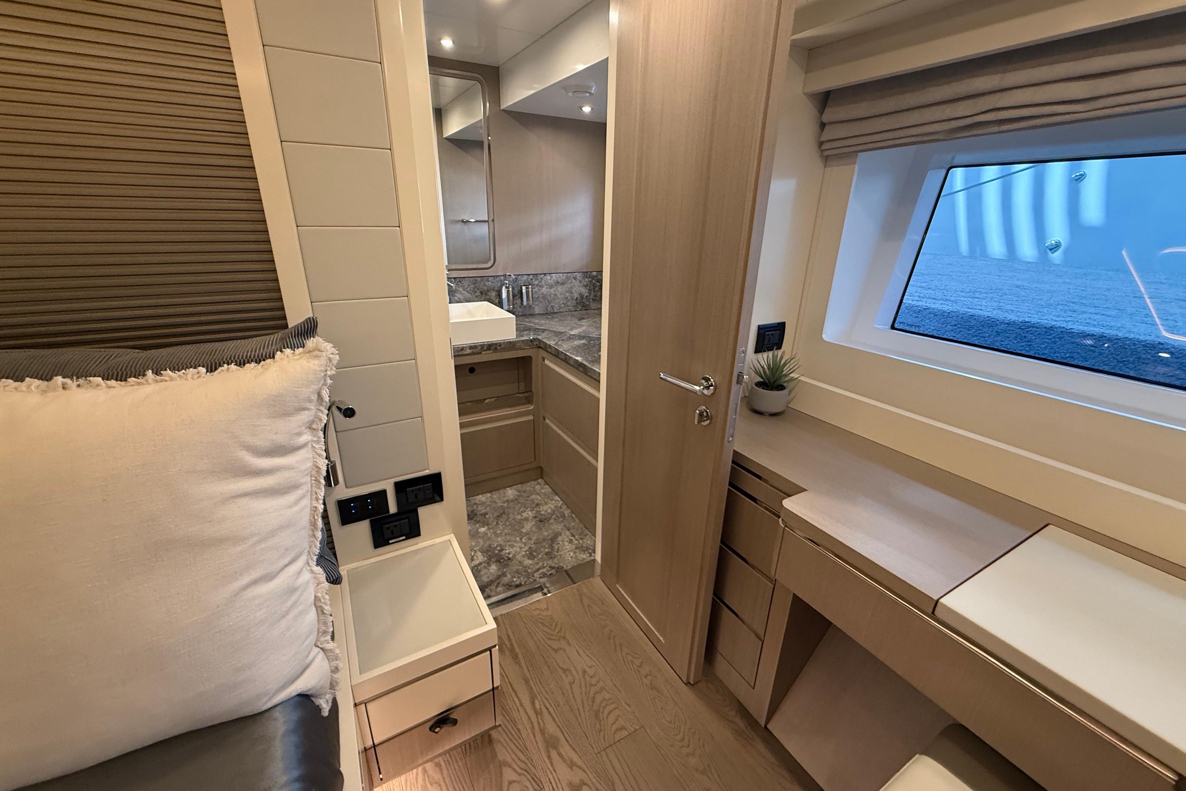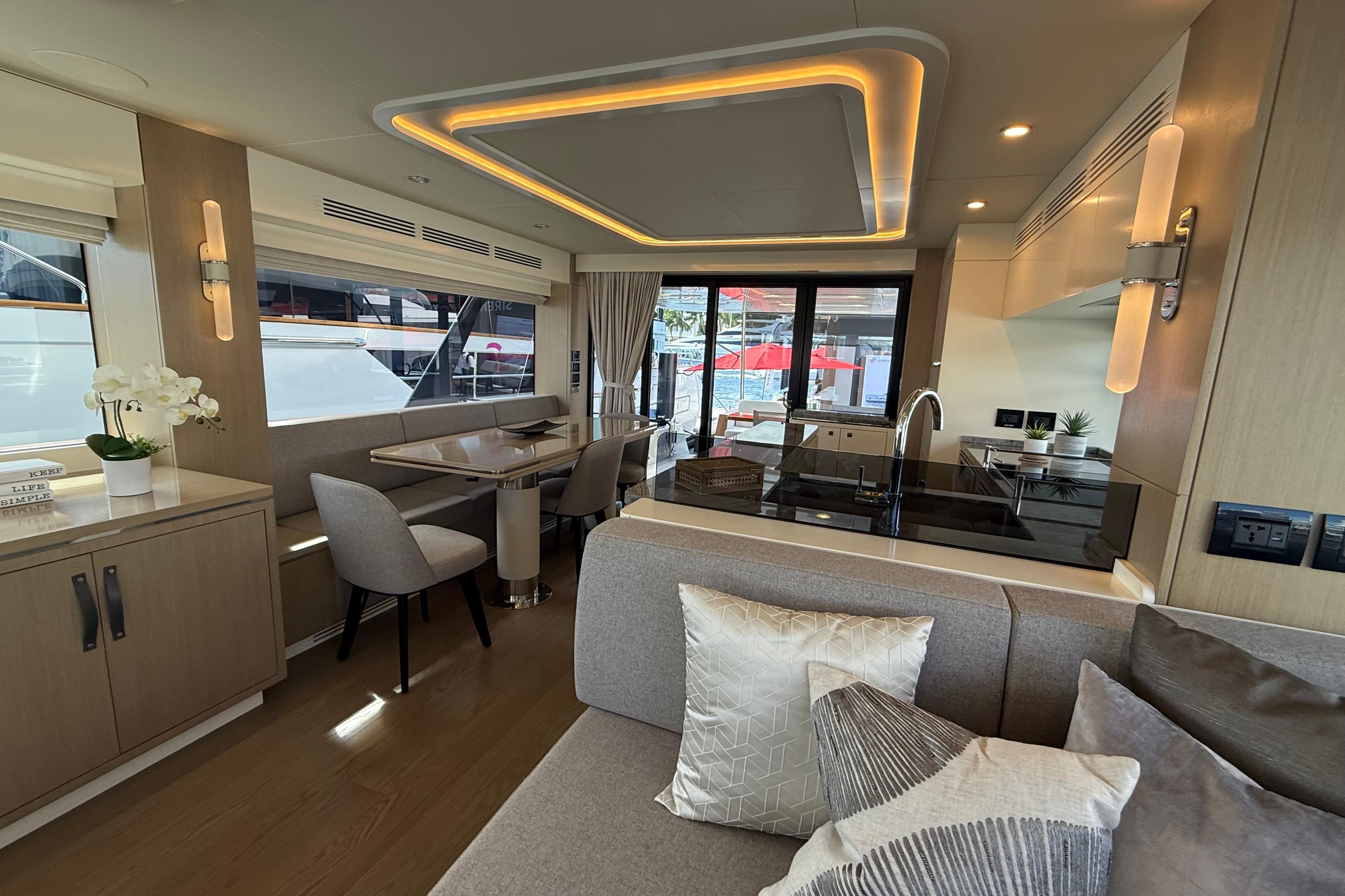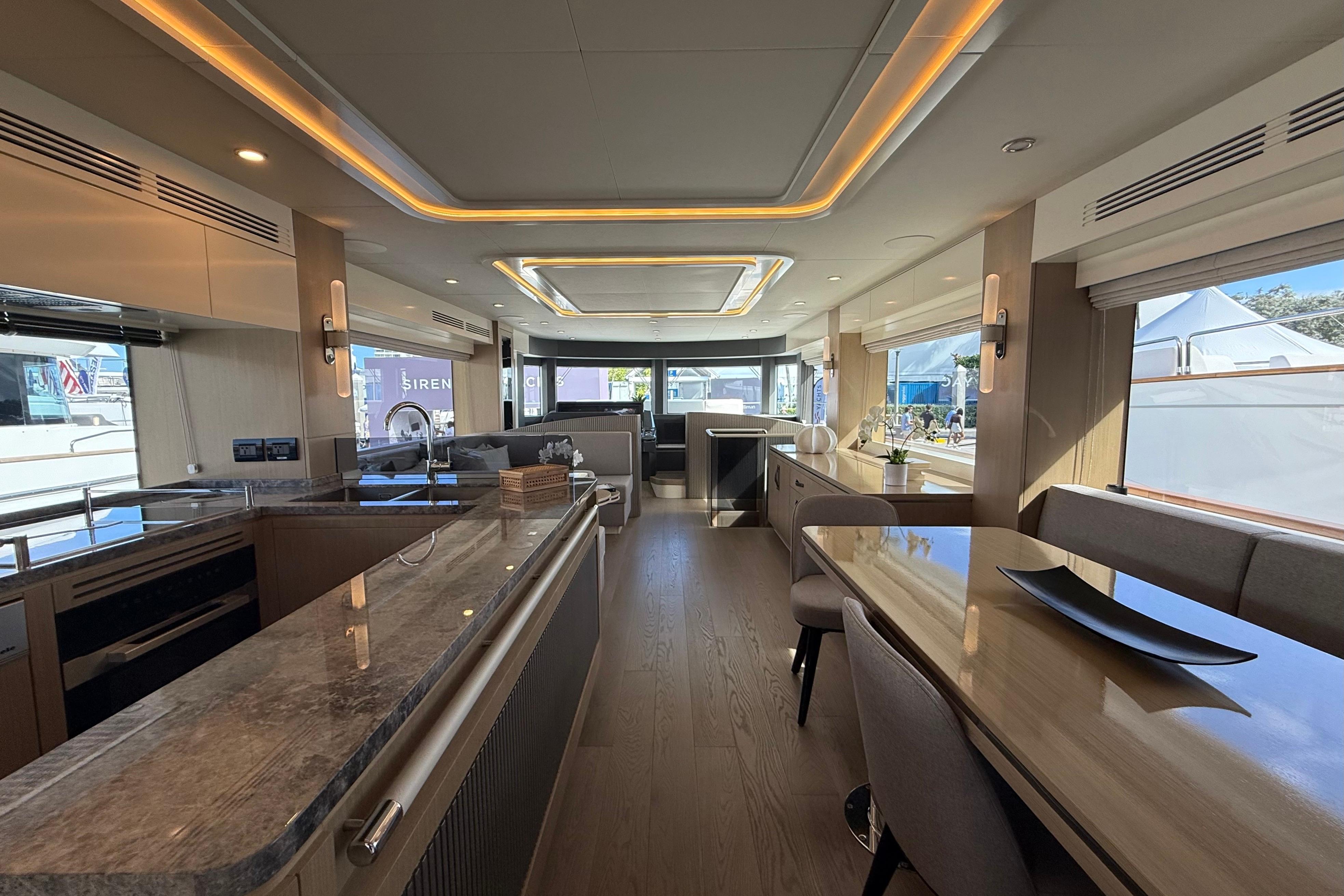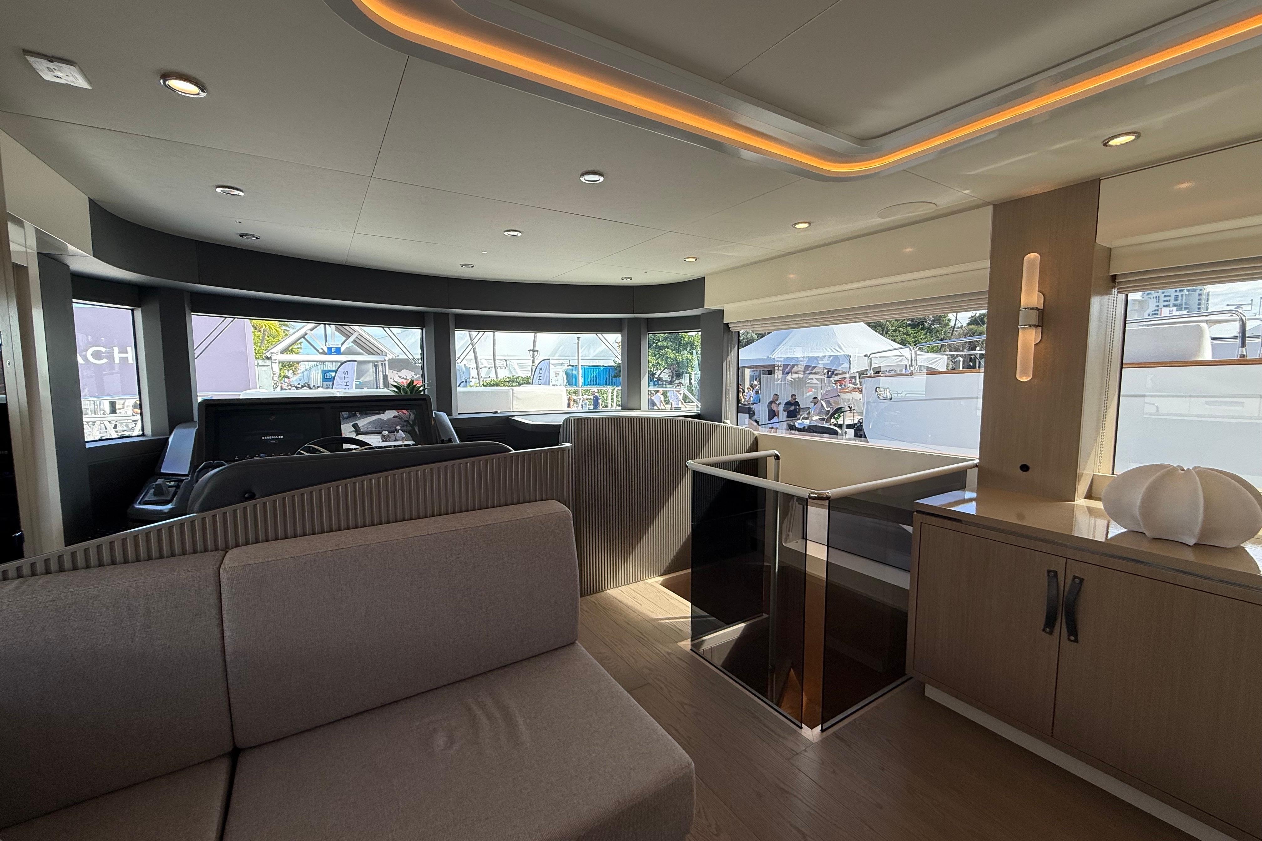 Inside, the Sirena 68 feels open and welcoming. Full-height windows bring in amazing natural light, and the aft galley keeps everything connected to the cockpit and salon. Below deck, owners can choose between three or four cabins. The full-beam master suite is a true retreat, featuring panoramic windows and a beautifully designed ensuite. Guests will enjoy the spacious VIP forward cabin, along with well-appointed additional staterooms.