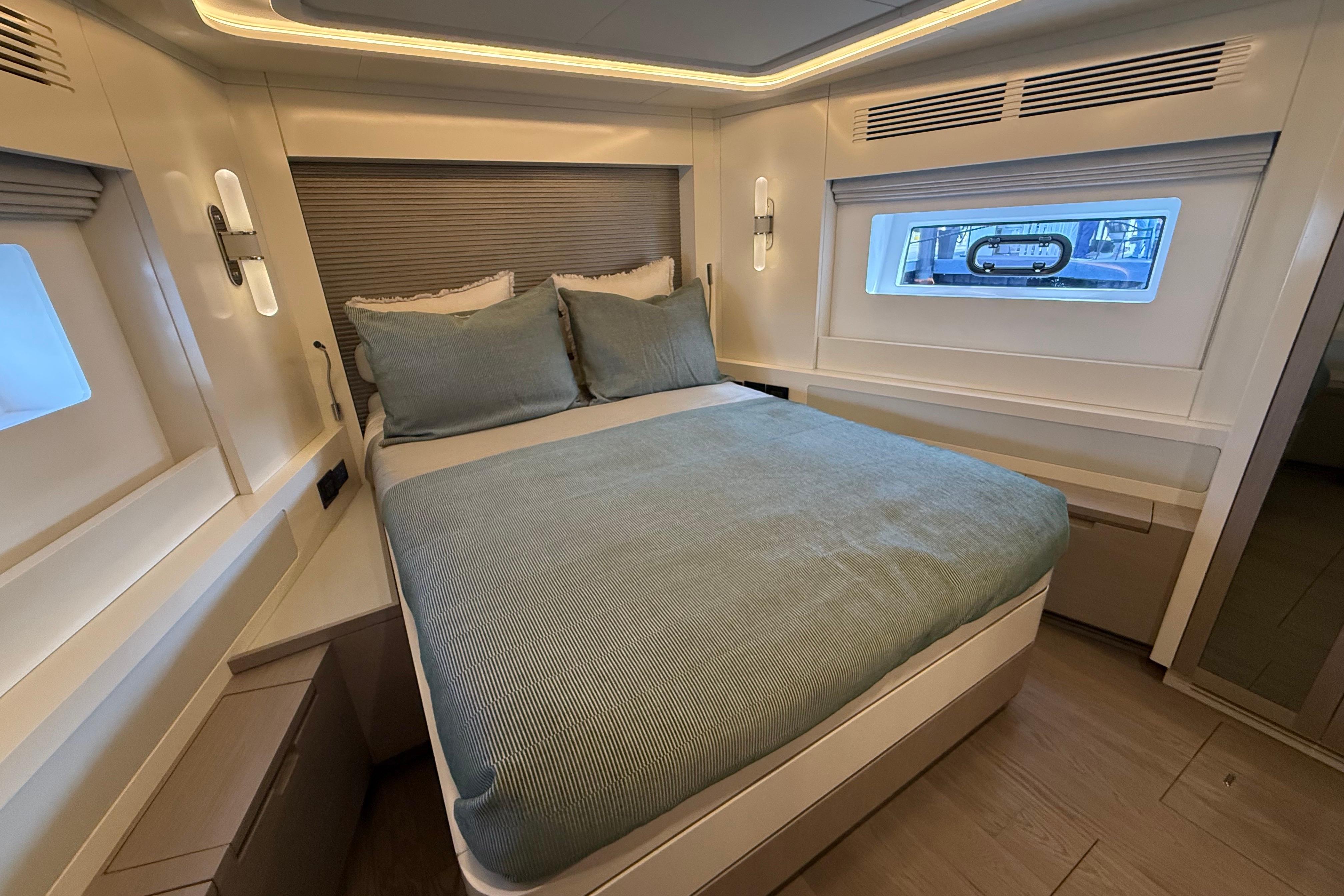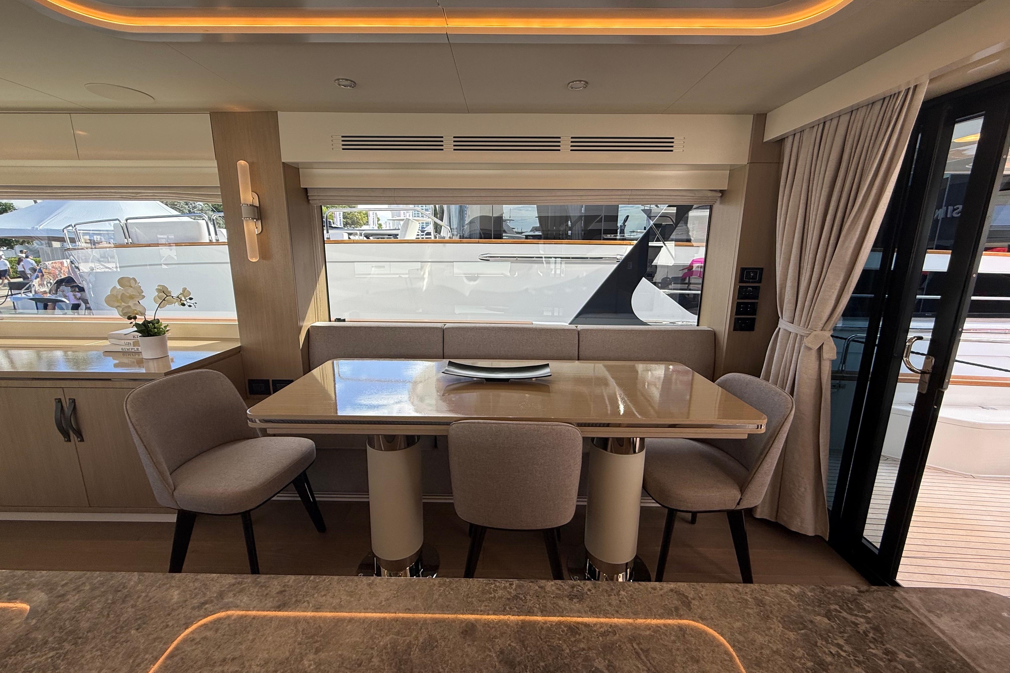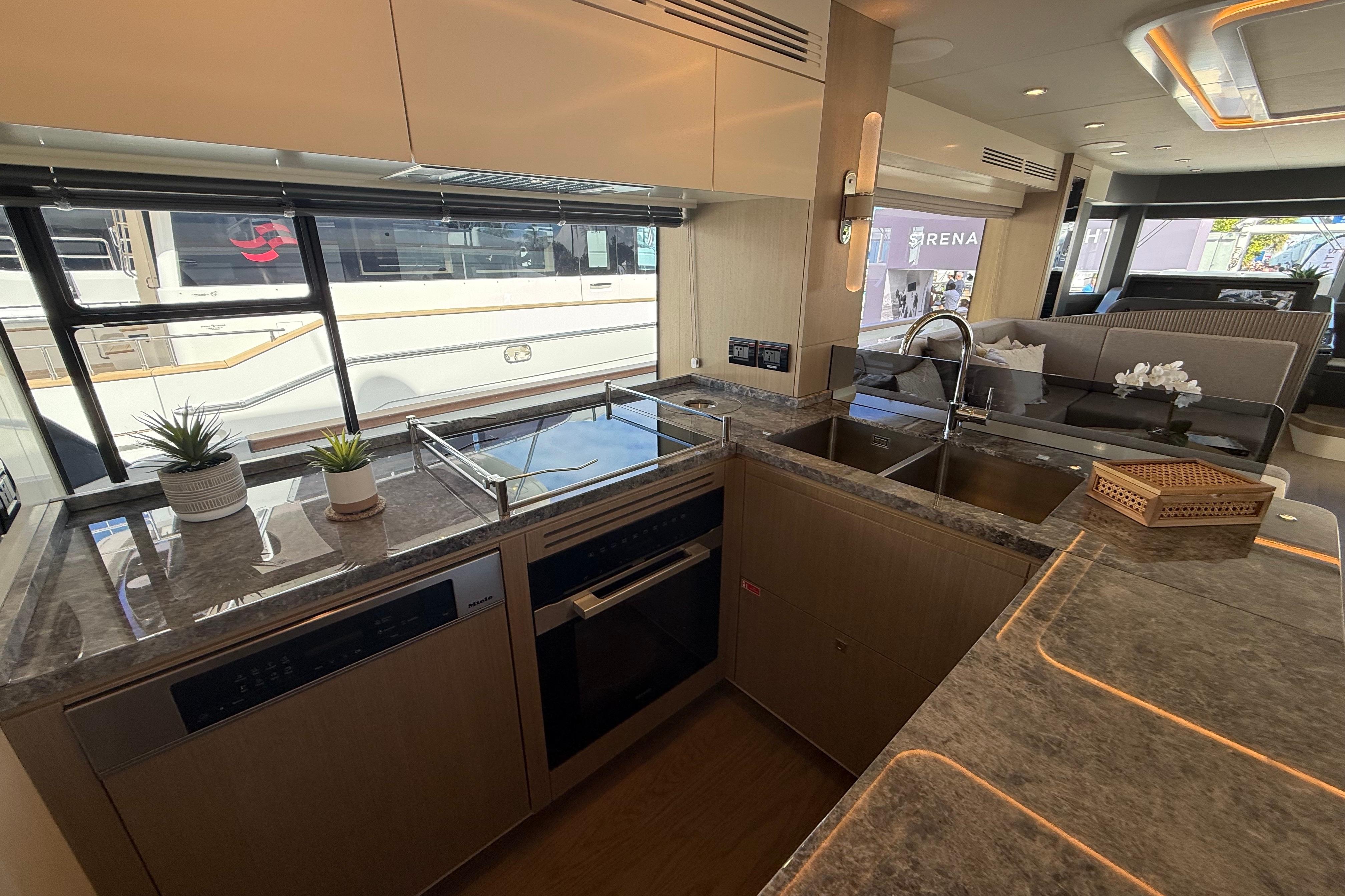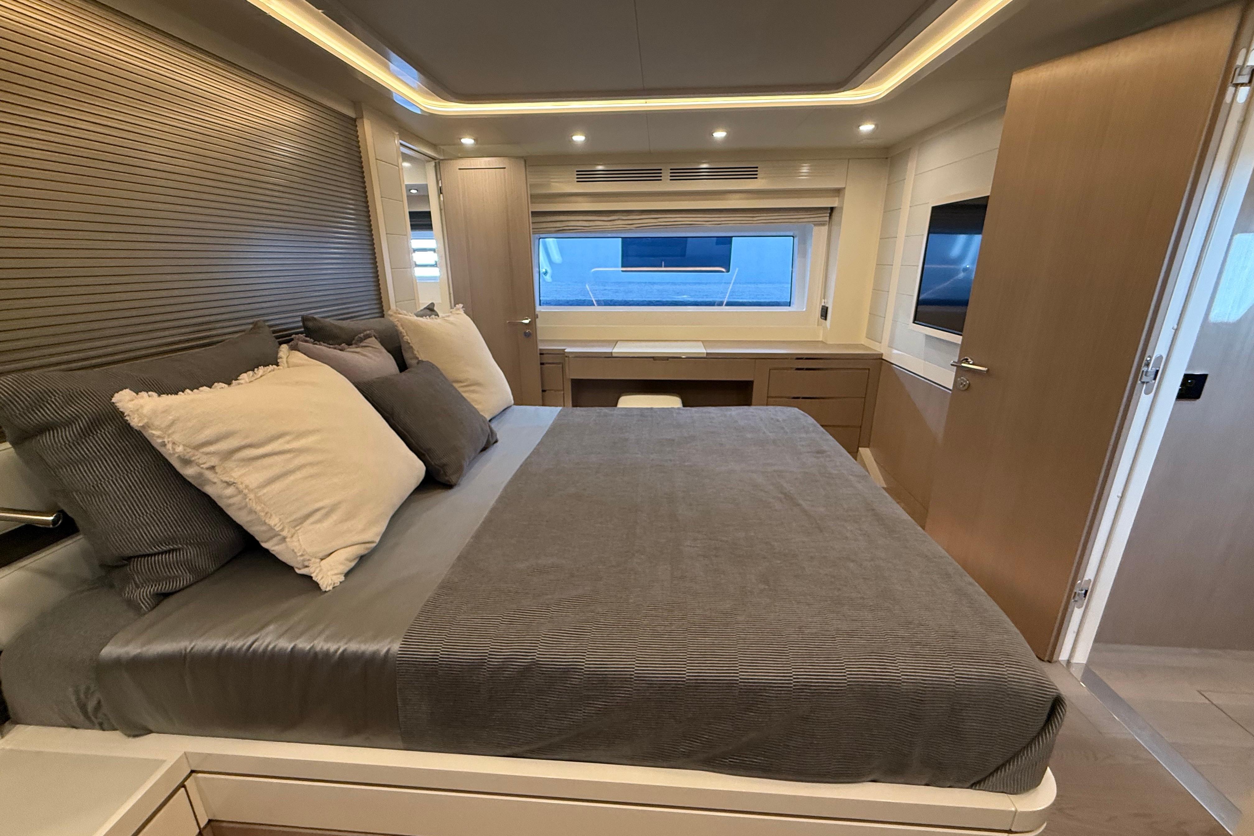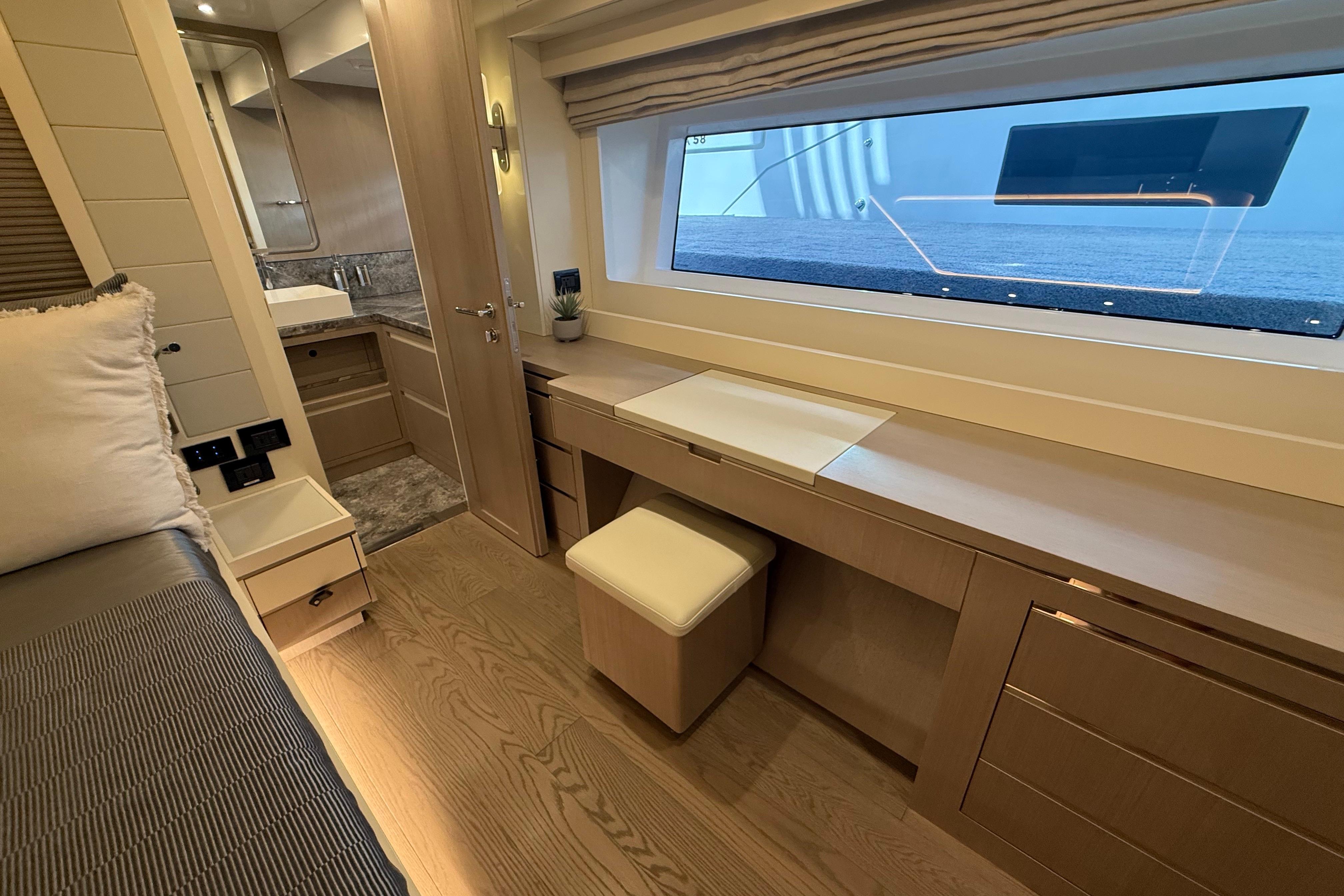 Inside, the Sirena 68 feels open and welcoming. Full-height windows bring in amazing natural light, and the aft galley keeps everything connected to the cockpit and salon. Below deck, owners can choose between three or four cabins. The full-beam master suite is a true retreat, featuring panoramic windows and a beautifully designed ensuite. Guests will enjoy the spacious VIP forward cabin, along with well-appointed additional staterooms.