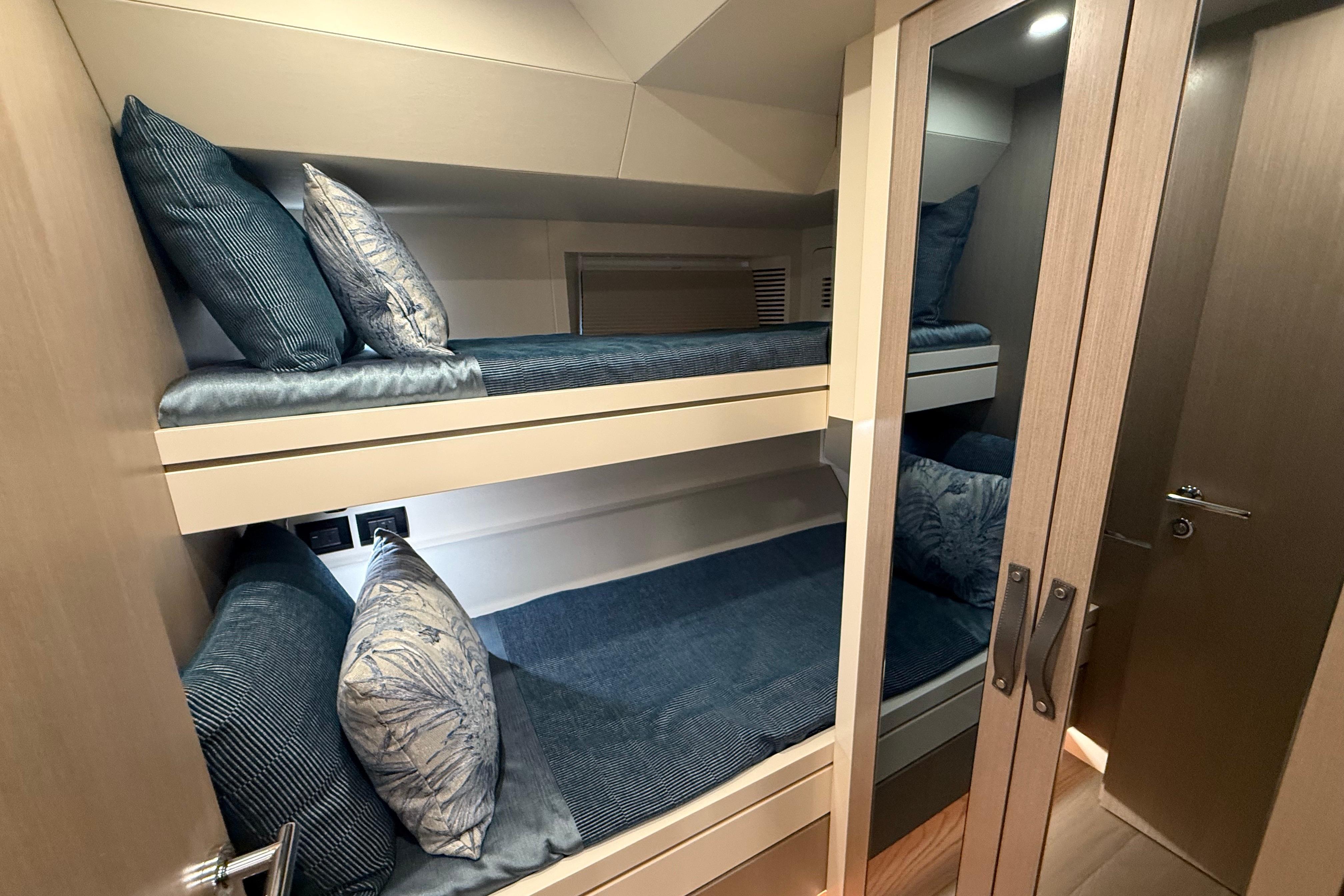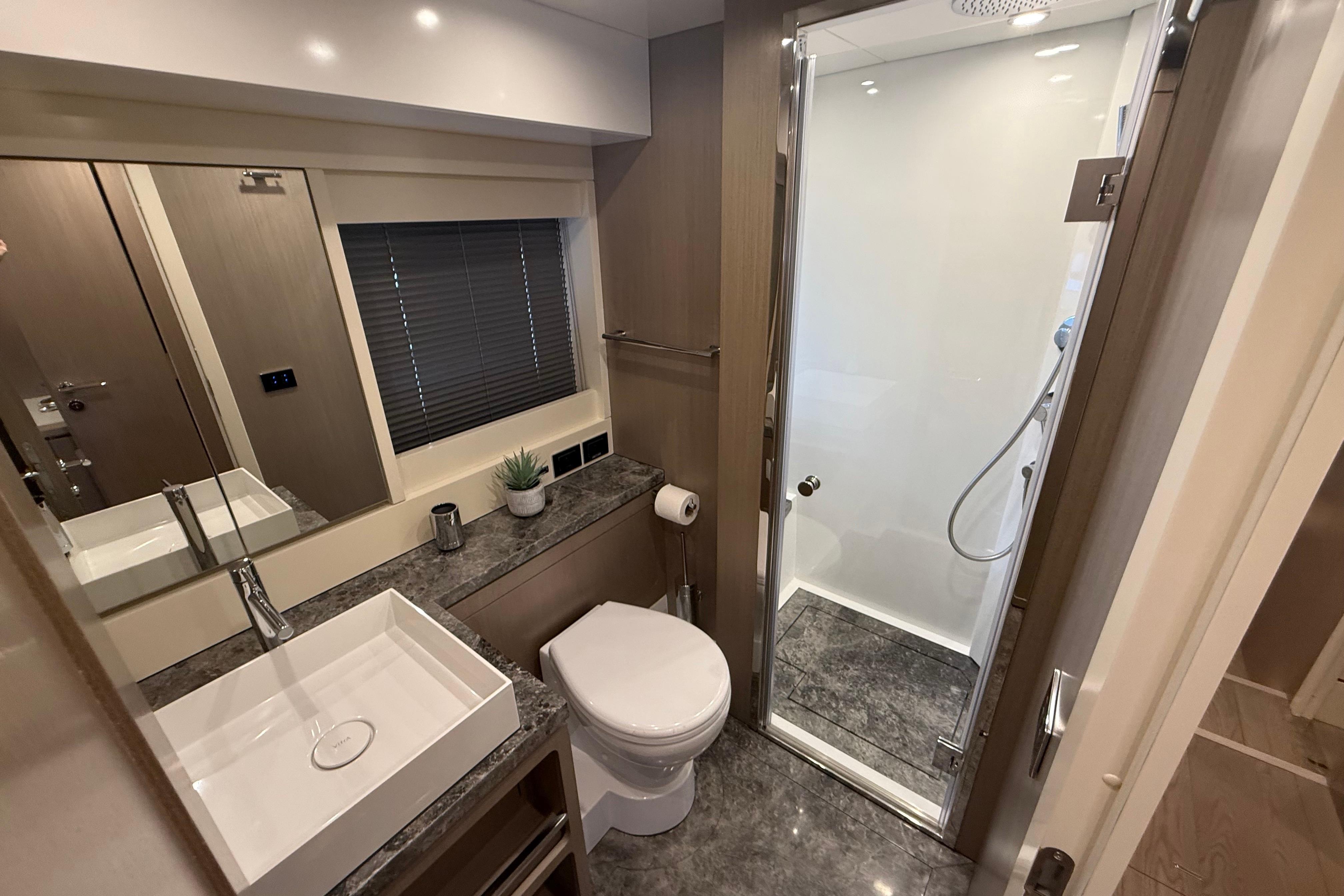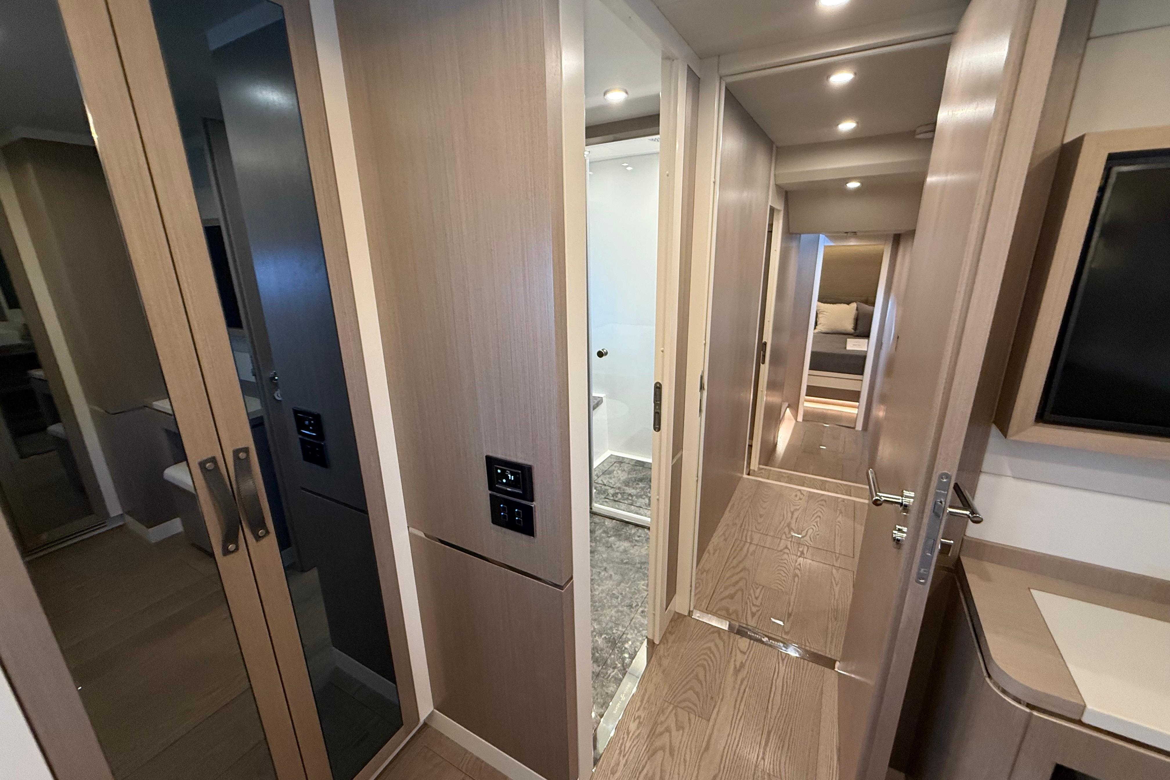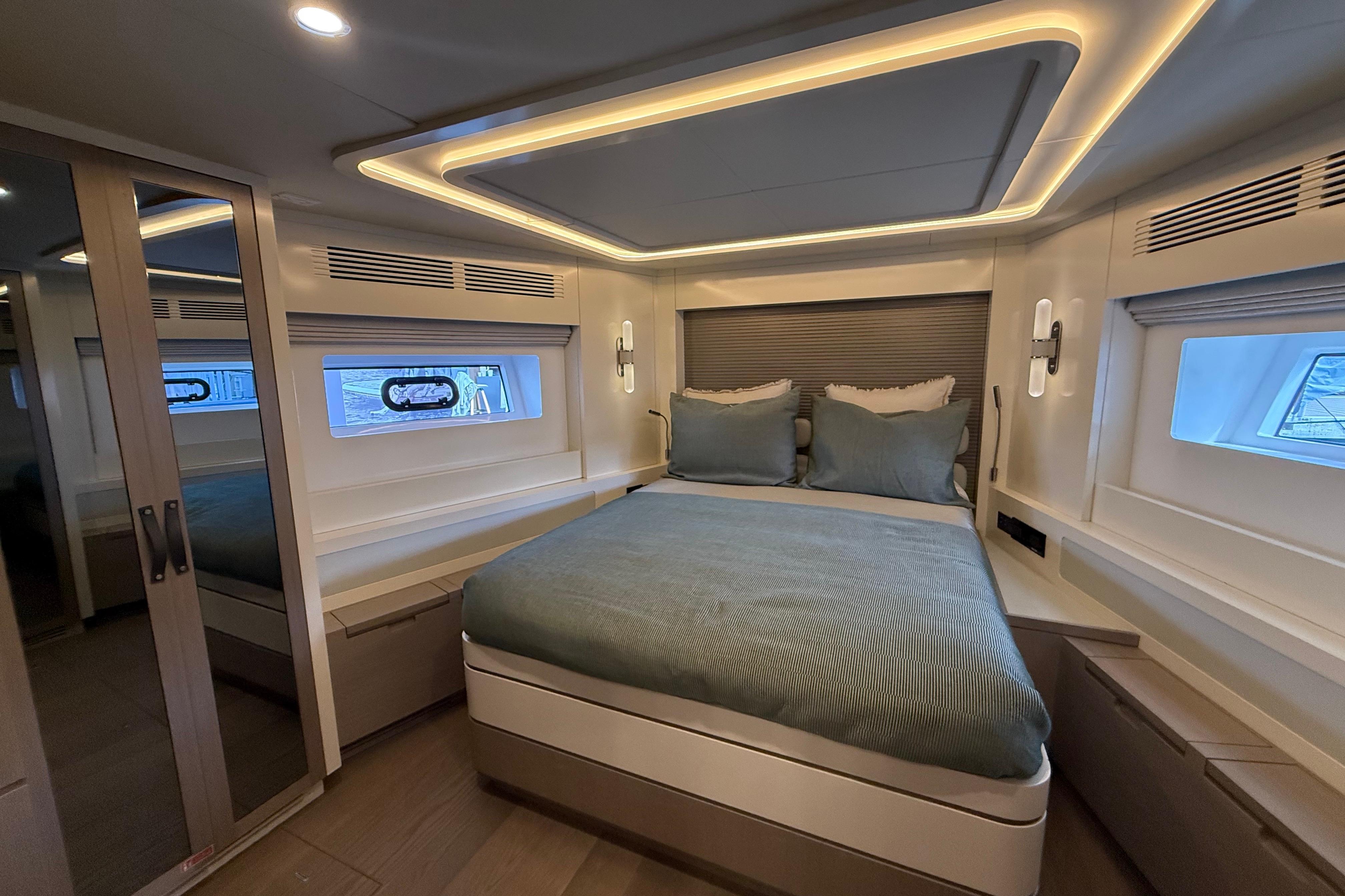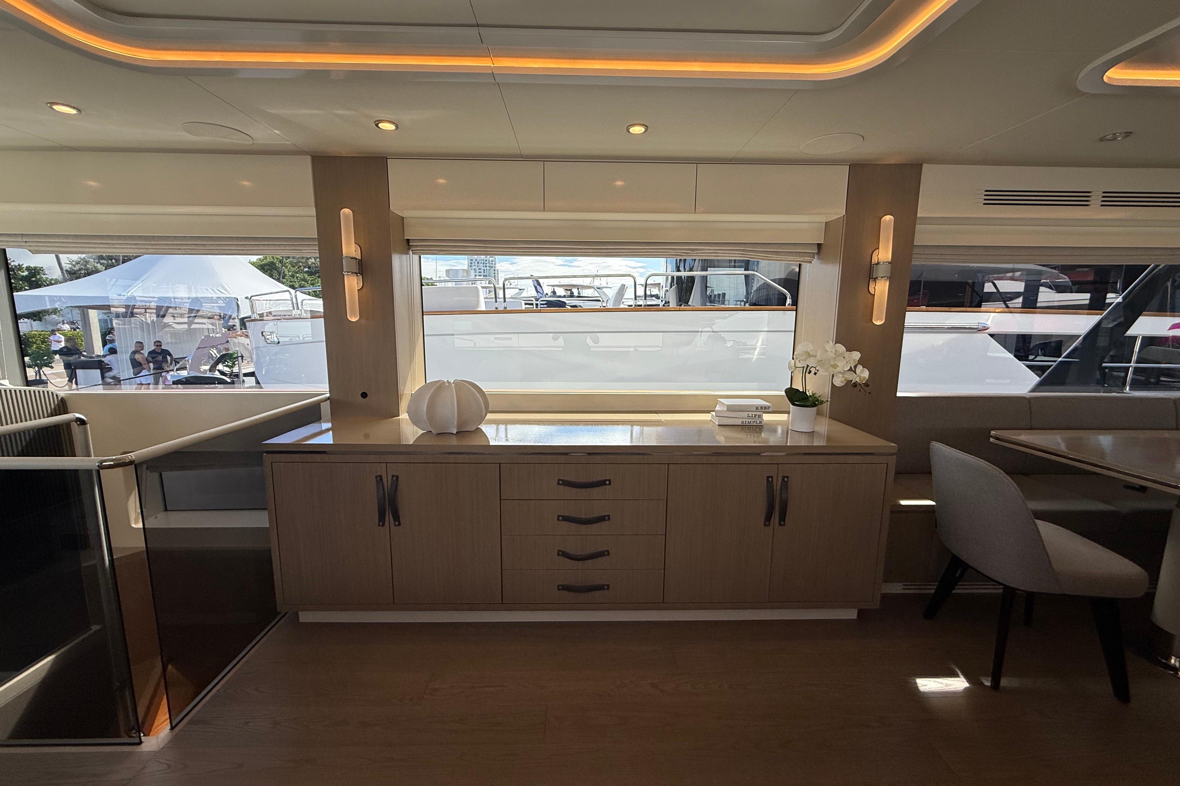 Inside, the Sirena 68 feels open and welcoming. Full-height windows bring in amazing natural light, and the aft galley keeps everything connected to the cockpit and salon. Below deck, owners can choose between three or four cabins. The full-beam master suite is a true retreat, featuring panoramic windows and a beautifully designed ensuite. Guests will enjoy the spacious VIP forward cabin, along with well-appointed additional staterooms.